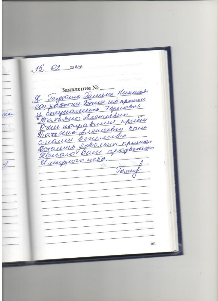 Я, Голдобина Галина Николаевна соц.работник. Были на приеме у специалиста Тарасовой Татьяны Алексеевны. Очень понравился прием, Татьяна Алексеевна была с нами вежлива. Остались очень довольны приемом. Желаю вам процветания и мирного неба.