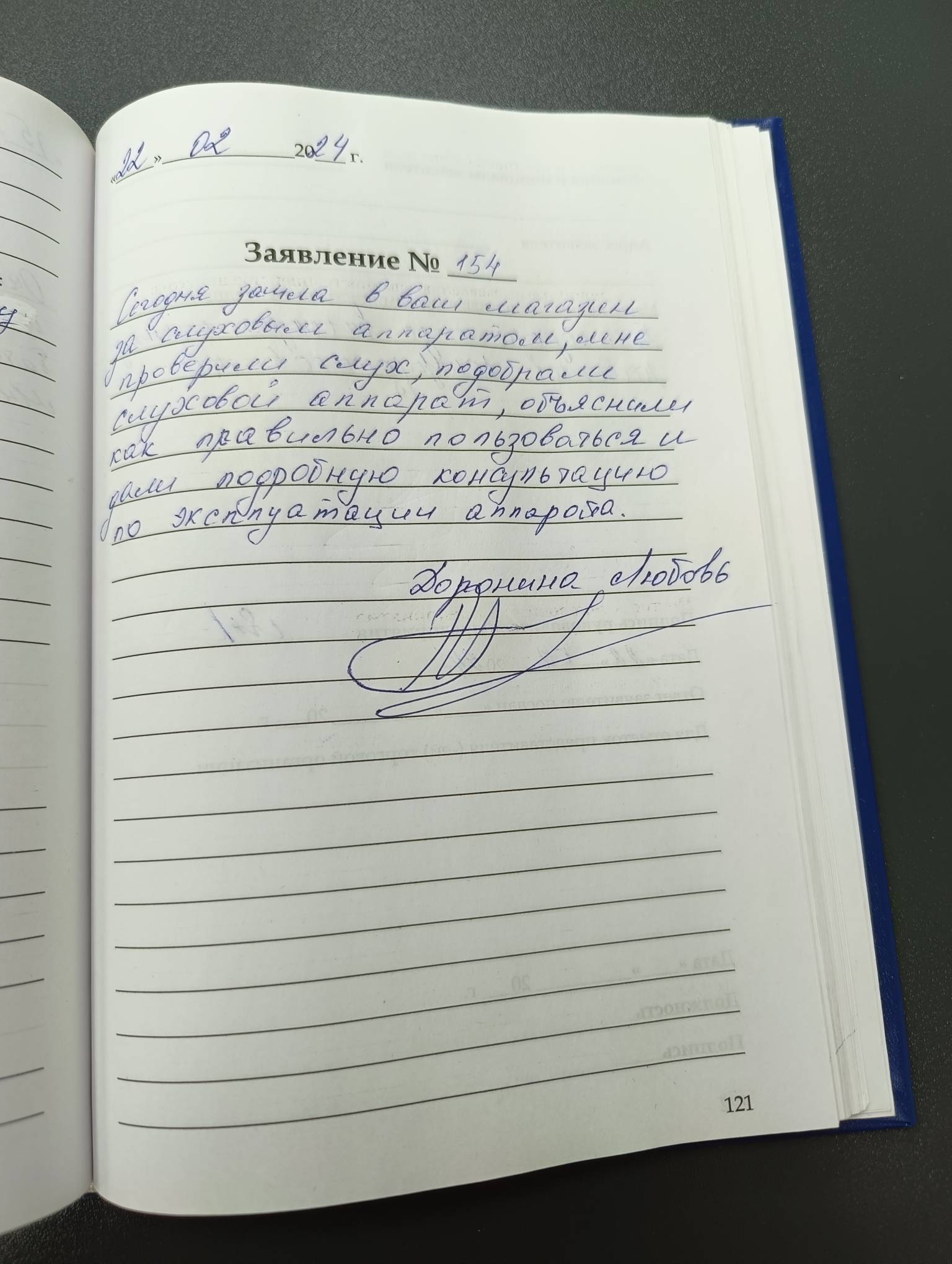 Сегодня зашла в ваш магазин за слуховыми аппаратами, мне проверили слух, подобрали слуховой аппарат, объяснили как правильно пользоваться и дали подробную консультацию по эксплуатации аппарата