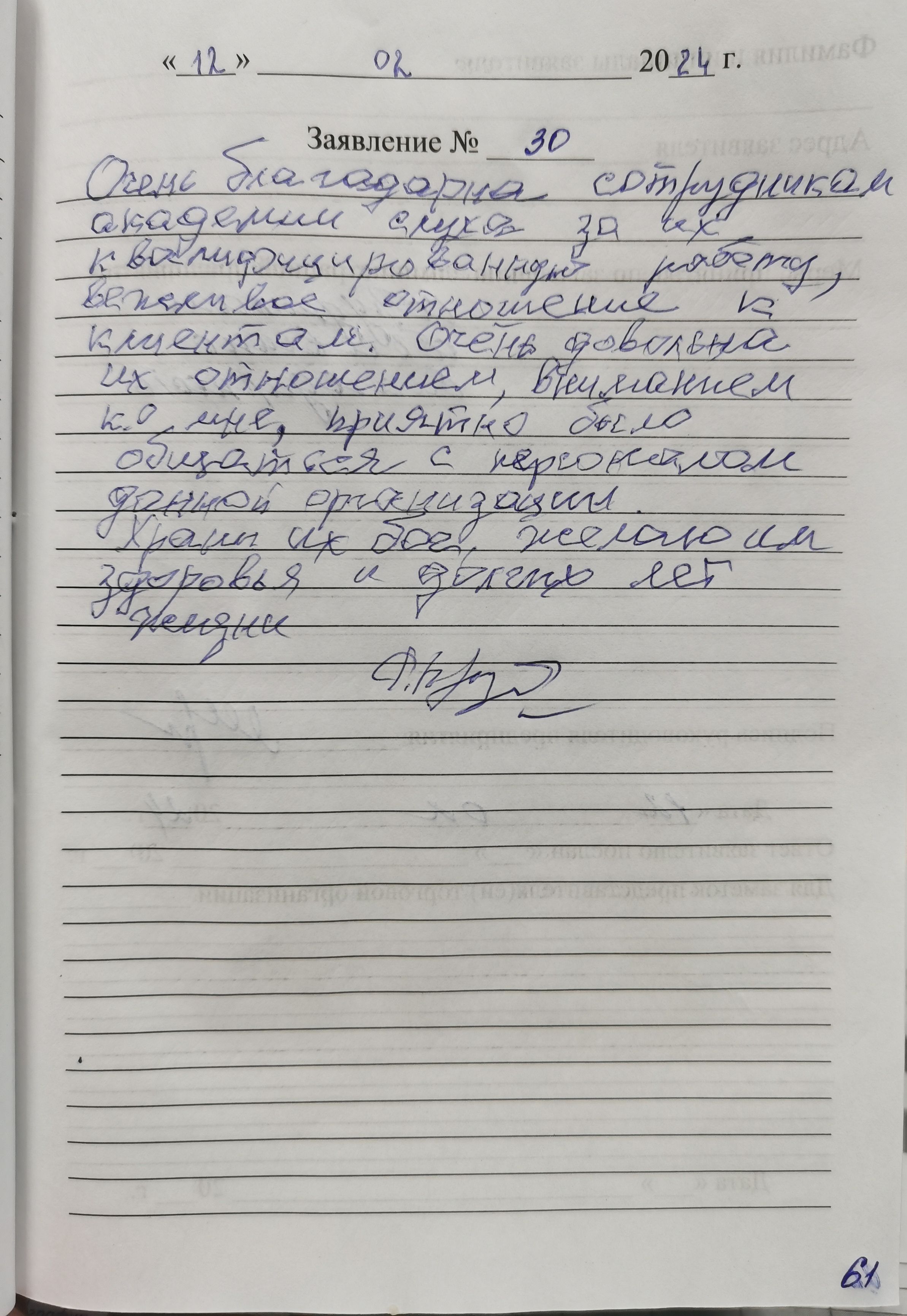 Благодарю за прекрасное обслуживание персонал "Академии Слуха". Очень внимательные и уважительные люди.