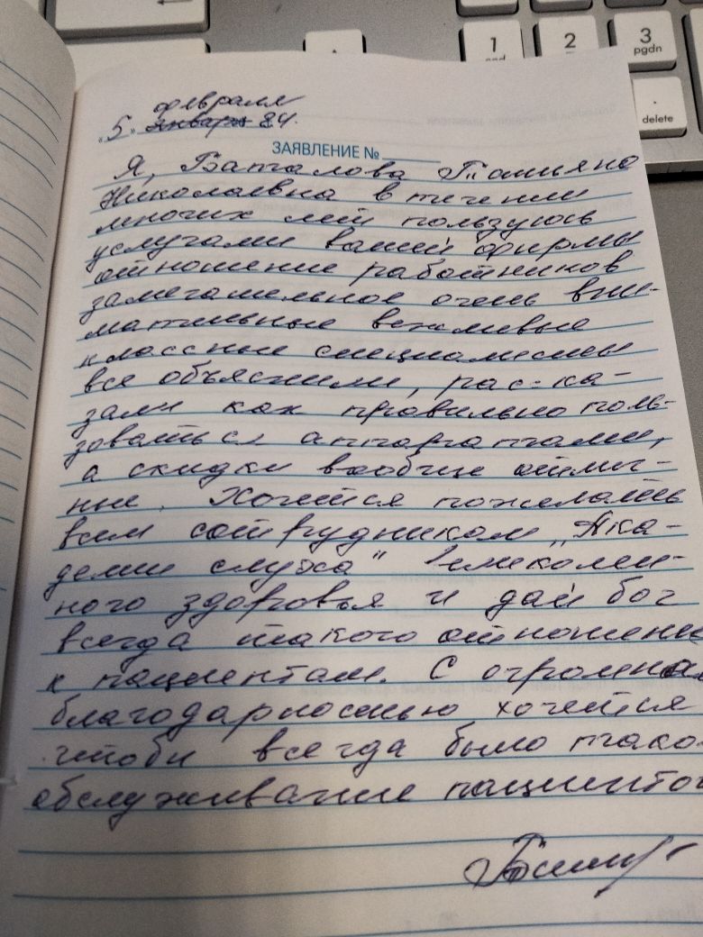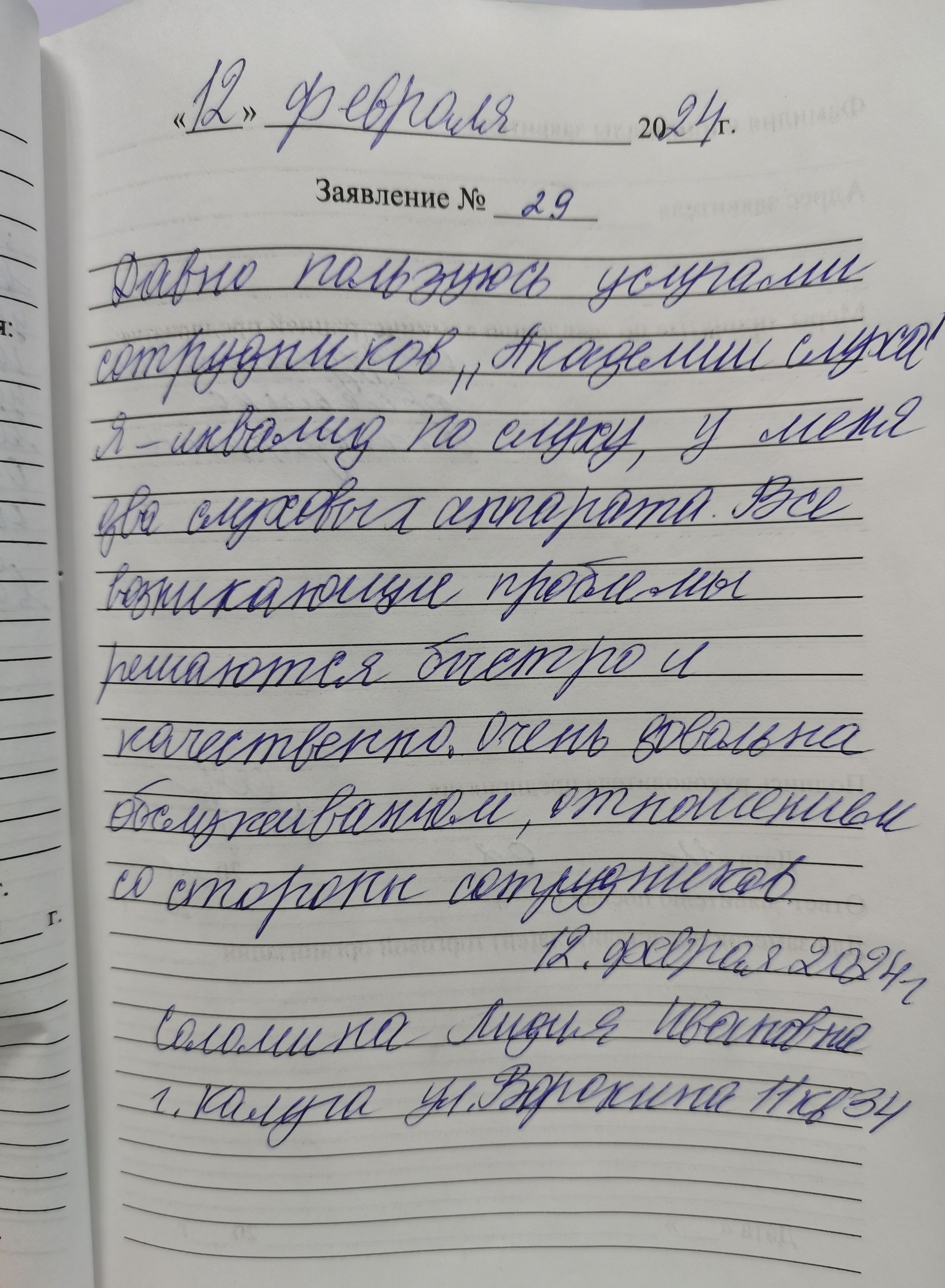 Я, Баталова Татьяна Николаевна в течении многих лет пользуюсь услугами вашей фирмы. Отношение работников замечательное очень внимательные вежливые классные специалисты все объяснили, рассказали как правильно пользоваться аппаратами, а скидки вообще отличные.Хочется пожелать всем сотрудникам "Академии Слуха" великолепного здоровья и дай Бог всегда такого отношения к пациентам. С огромной благодарностью, хочется чтобы всегда было такое обслуживание пациентов.