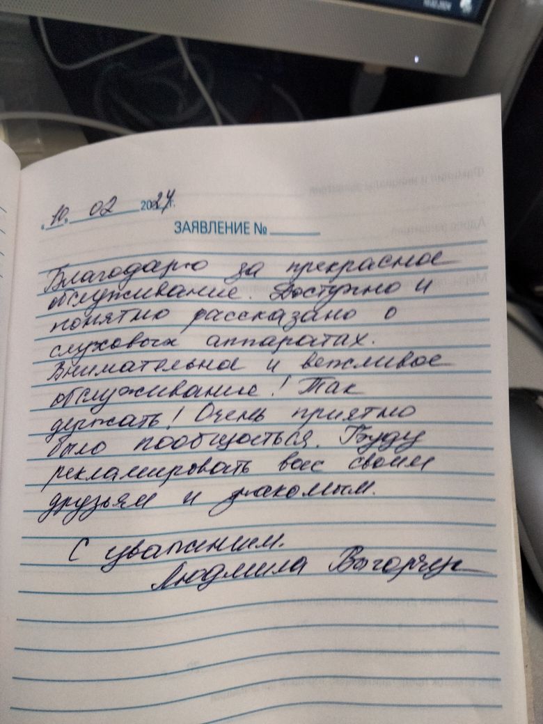 Благодарю за прекрасное обслуживание. Доступно и понятно рассказано о слуховых аппаратах. Внимательное и вежливое обслуживание!. Так держать! Очень приятно было пообщаться. Буду рекламировать вас своим друзьям и знакомым.