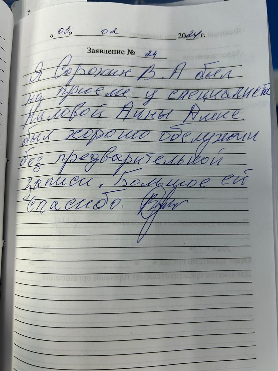 Я, Сорокин В.А. был на приеме у специалиста Ниловой Анны Александровны был хорошо обслужен без предварительной записи. Большое ей спасибо.