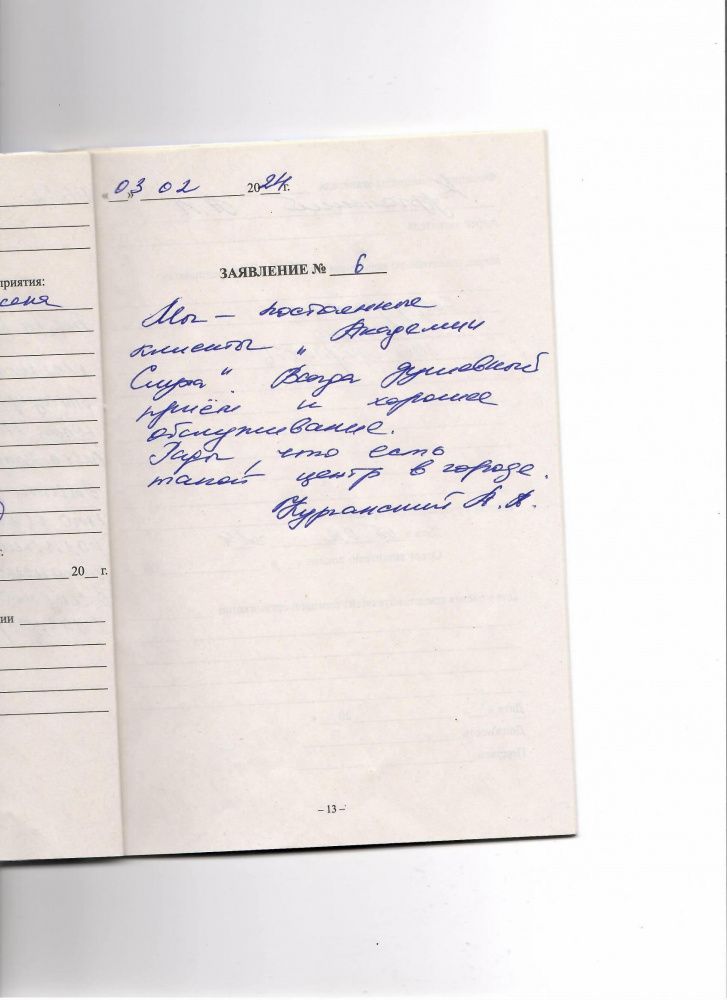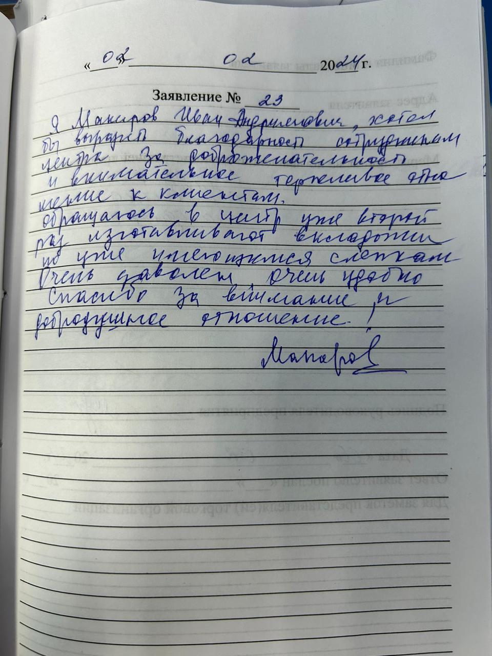 Я, Макаров Иван Андриянович, хотел бы выразить благодарность сотрудникам центра за доброжелательность и внимательное терпеливое отношение к клиентам. Обращаюсь в центр уже второй раз изготавливают вкладыши по уже имеющимся слепкам. Очень доволен, очень удобно. Спасибо, за внимание и добродушное отношение!