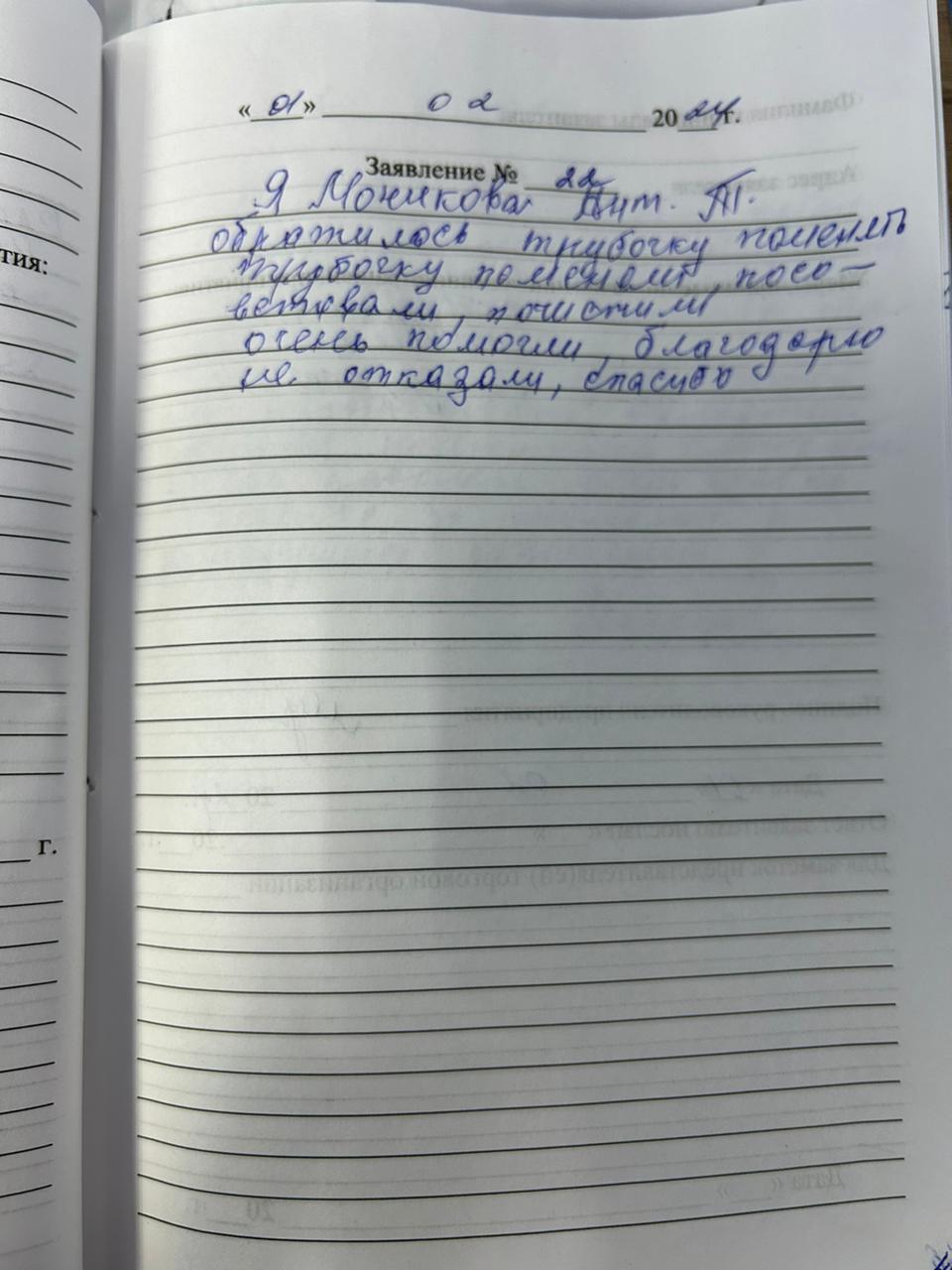 Я, Моникова Антонина Т. обратилась трубочку поменять, посоветовали, почистили, очень помогли. Благодарю. Не отказали, спасибо!