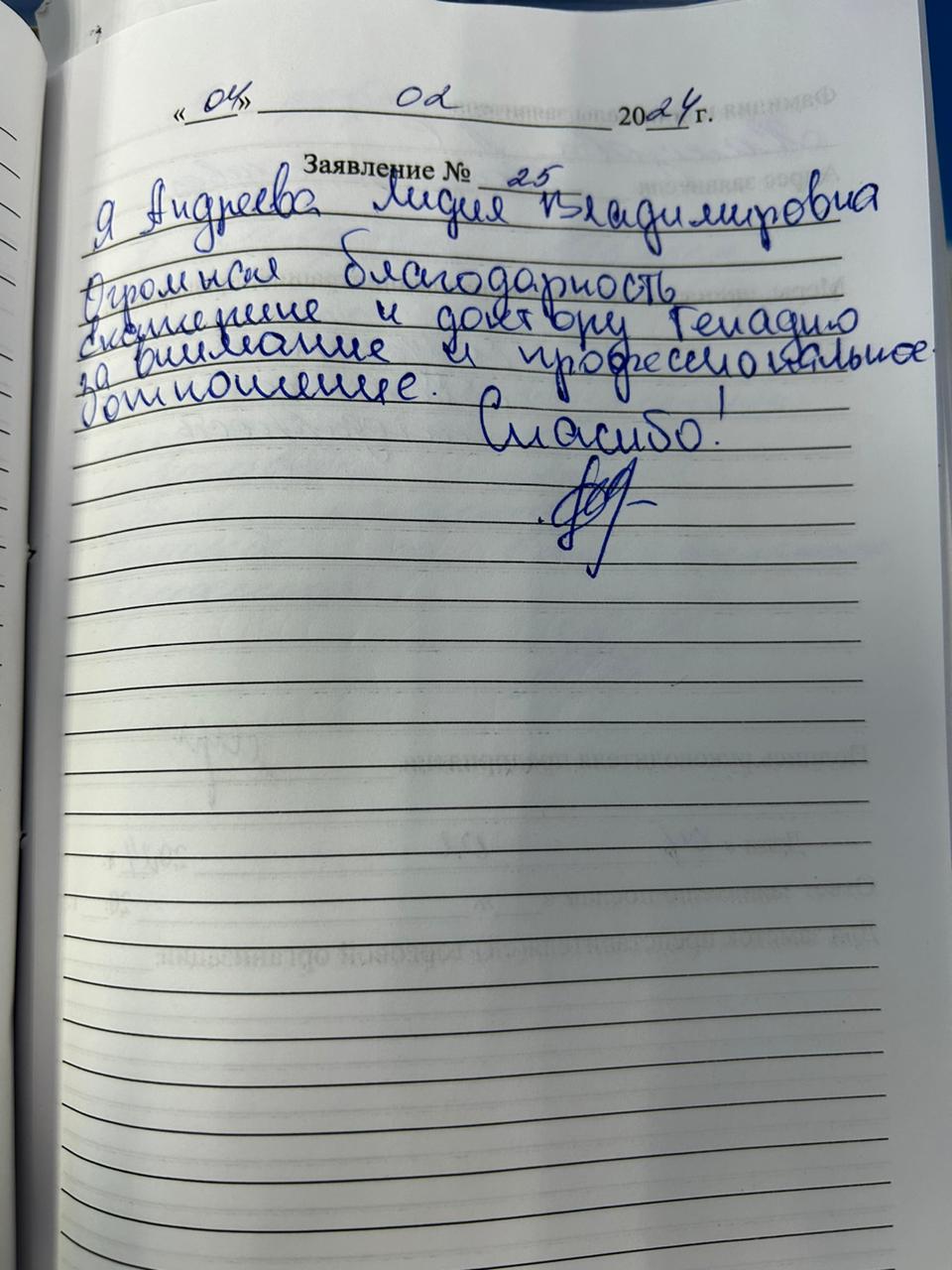 Я, Андреева Лидия Владимировна. Огромная благодарность Екатерине и доктору Геннадию за внимание и профессиональное отношение. Спасибо!