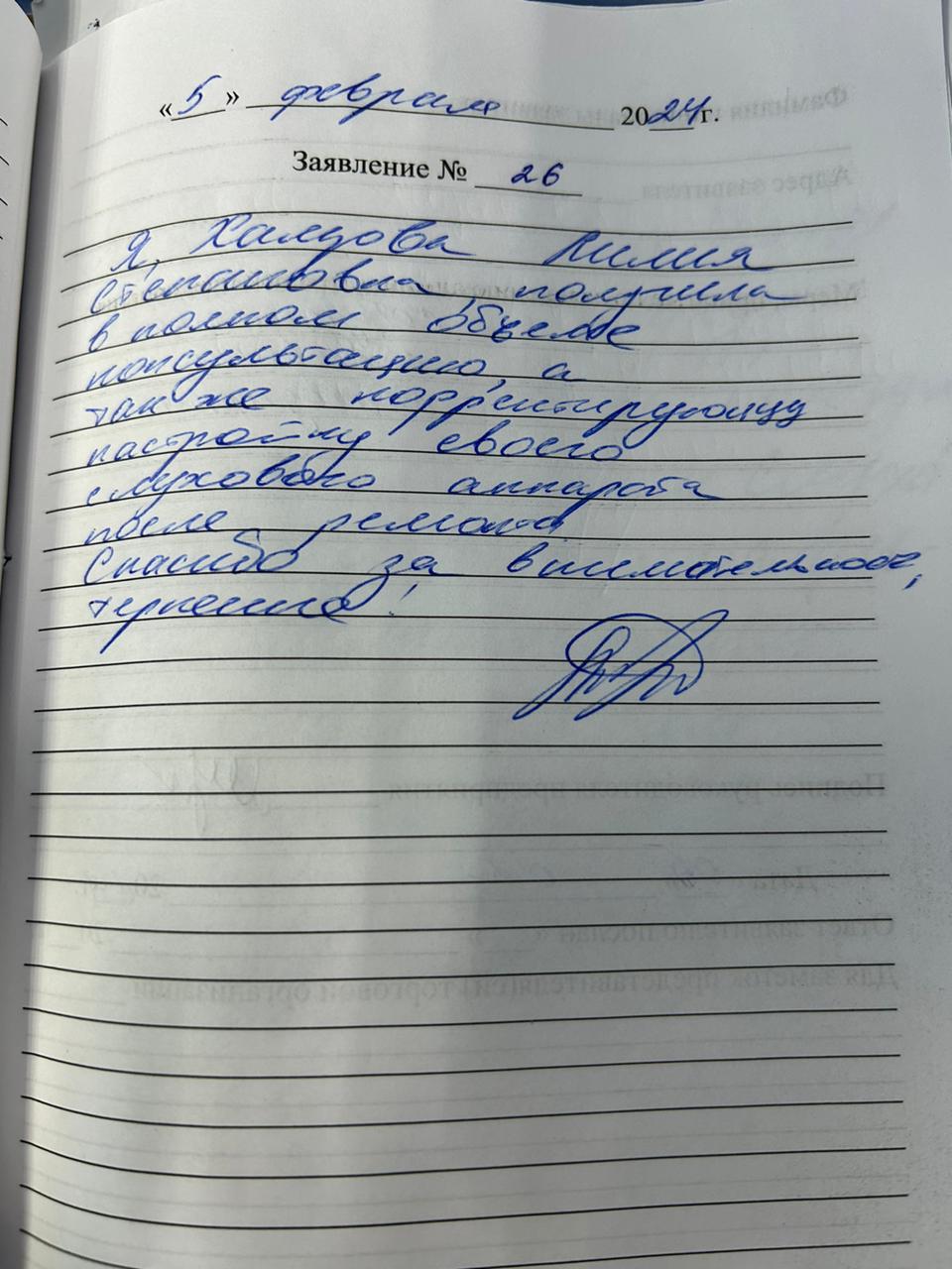 Я, Халезова Лилия Степановна, получила в полном объеме консультацию, а также корректирующую настройку своего аппарат после ремонта. Спасибо, за внимательность и терпение!