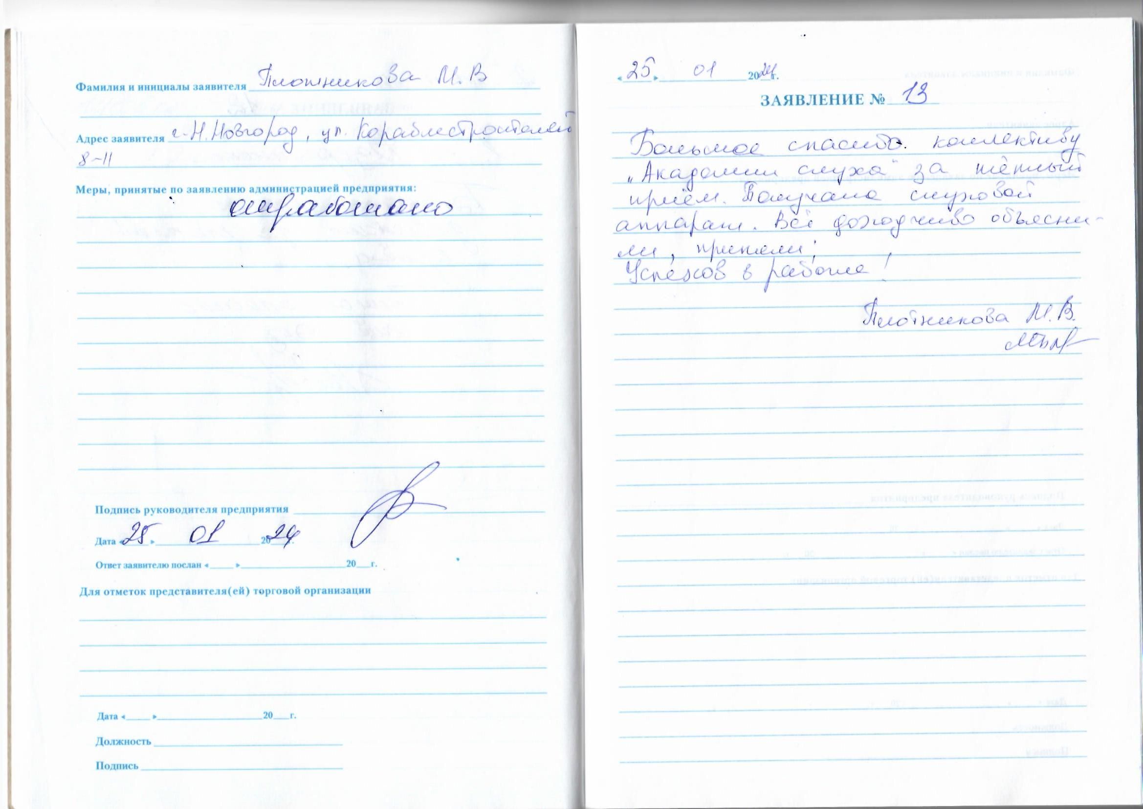 Хочу выразить огромную благодарность коллективу центра за чуткость, внимательность, профессионализм и отношение к нам таким нетерпеливым и требовательным плохо слышащим людям
