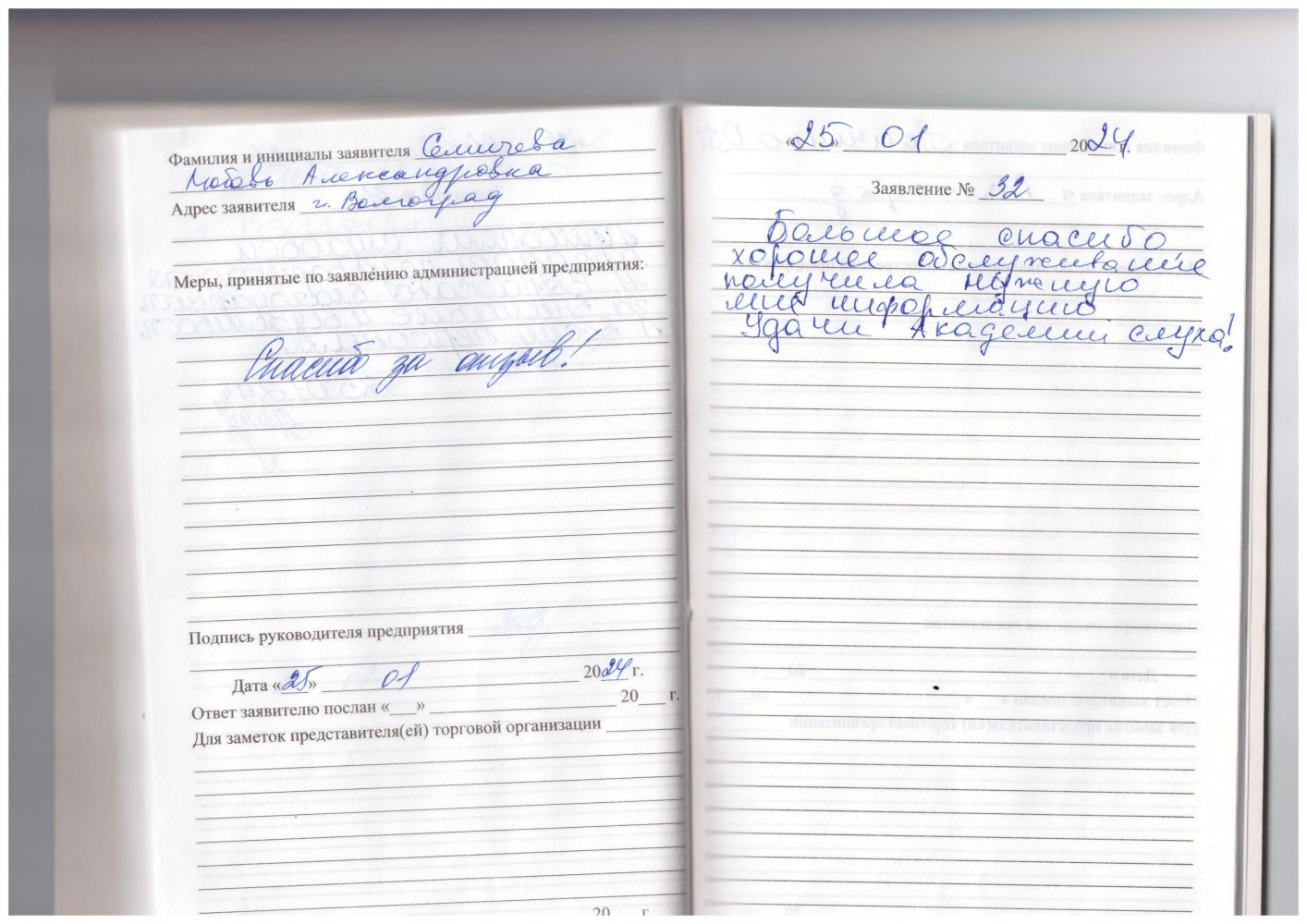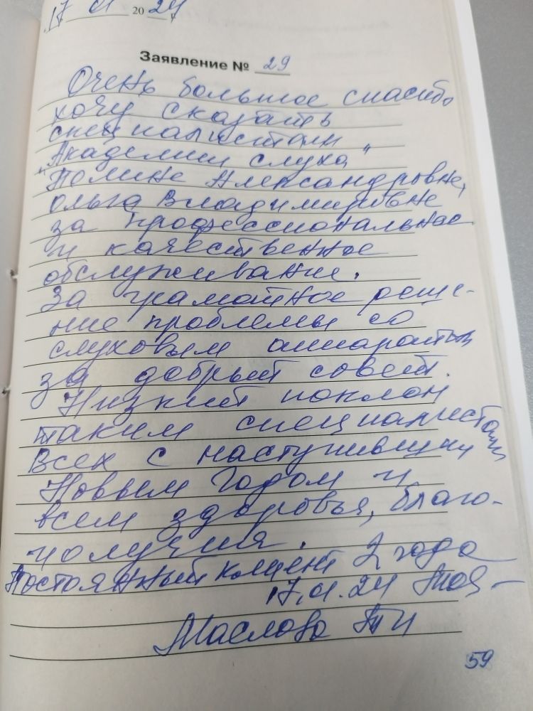 Очень большое спасибо хочу сказать специалистам "Академии слуха" Полине Александровне, Ольге Владимировне за профессиональное и качественное обслуживание. За грамотное решение проблемы со слуховым аппаратом, за добрый совет. Низкий поклон таким специалистам. Всех с наступившим Новым Годом и всем здоровья, благополучия. Постоянный клиент 2 года. Маслова Т.И.