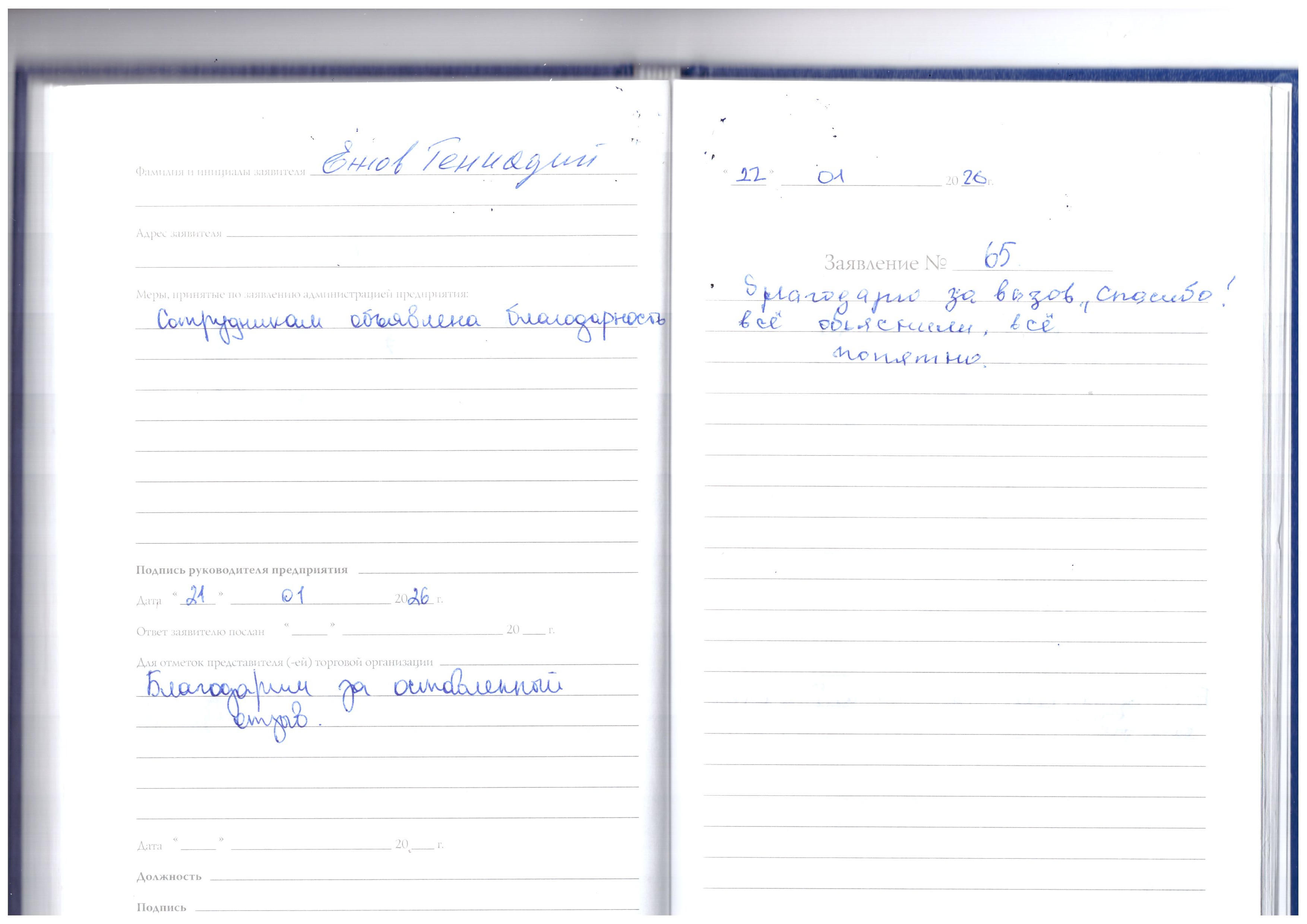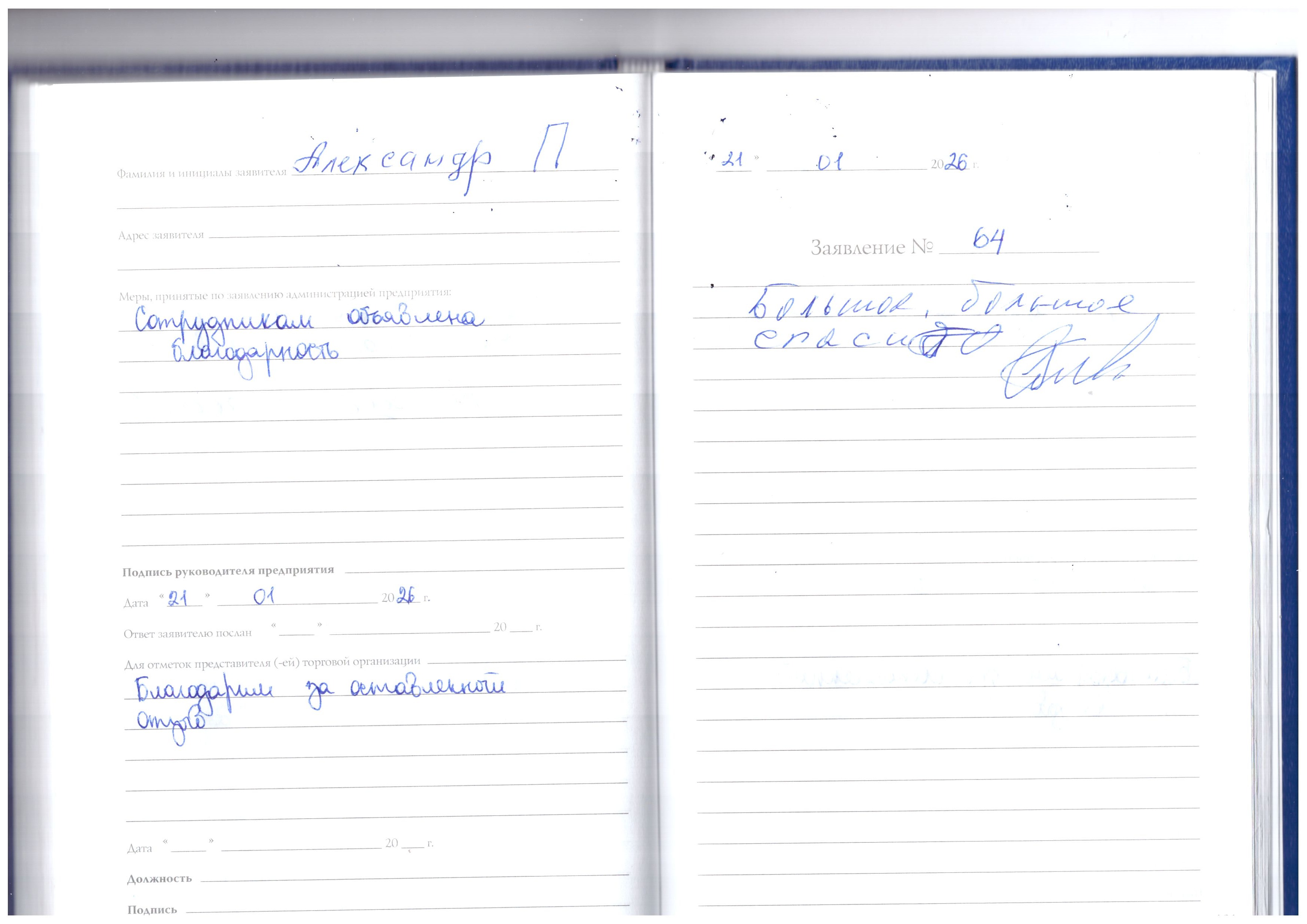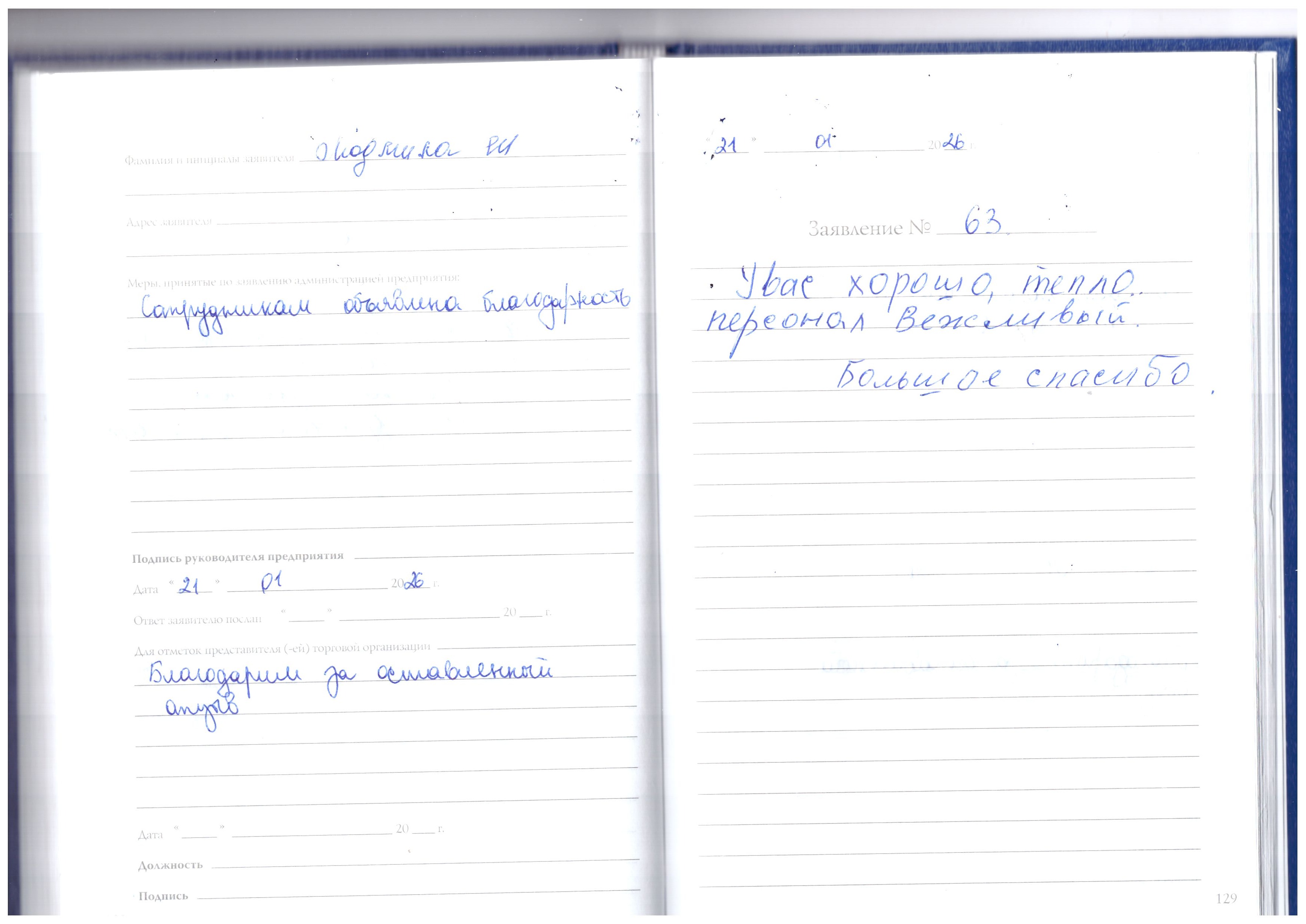 Спасибо большое за внимательное отношение и прекрасное обслуживание. Сысоев Б.И.