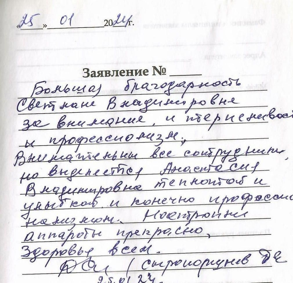 Большая благодарность Светлане Владимировне за внимание и терпеливость,профессионализм.Внимательны все сотрудники,но выделяется Анастасия Владимировна теплотой и улыбкой и конечно профессионализмом.Настроили аппараты прекрасно,здоровья всем.Сыропоршнев Дмитрий Егорович 25.01.2024