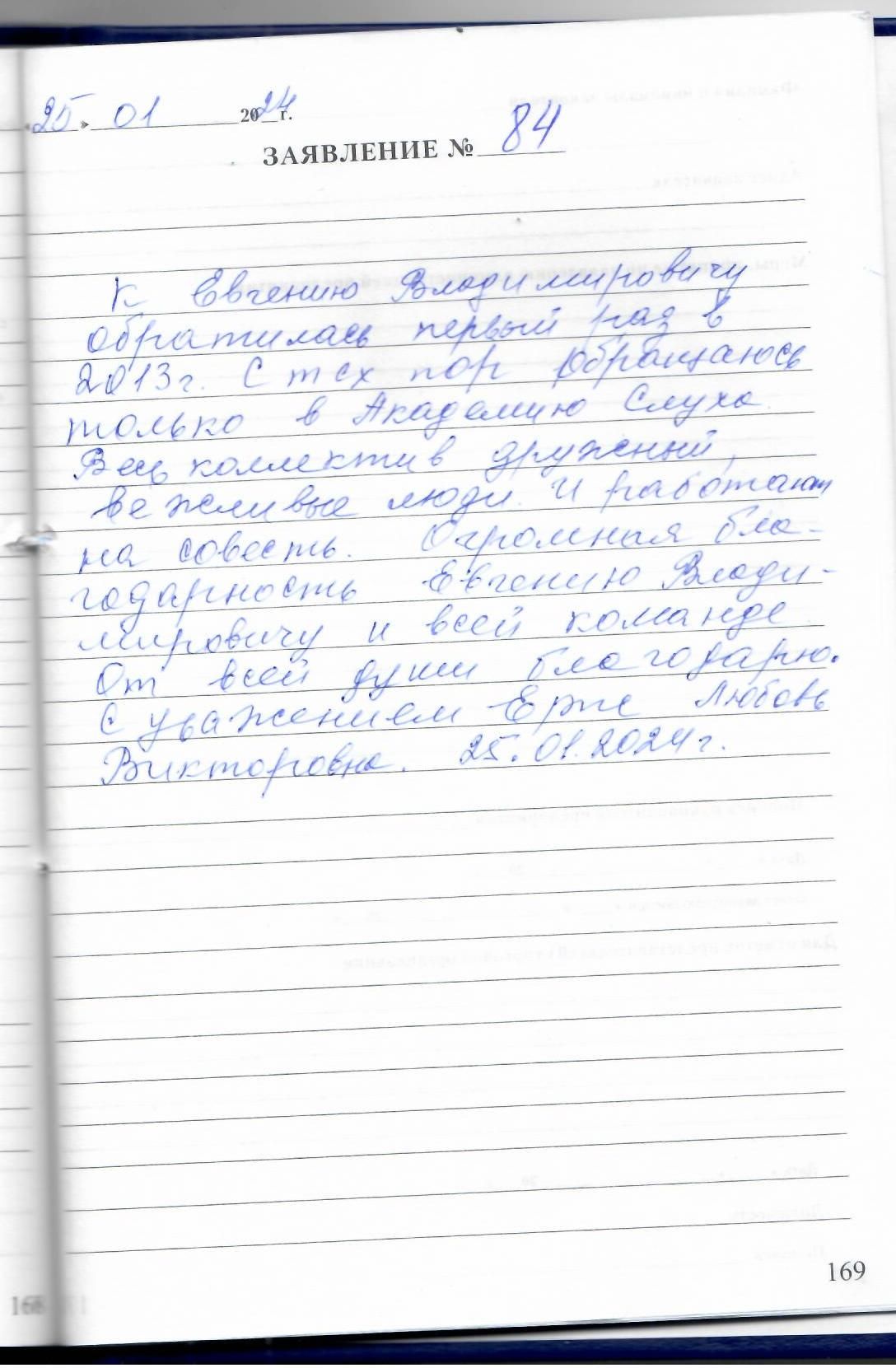 К Евгению Владимировичу обратилась первый раз в 2013г. С тех пор обращаюсь только в Академию слуха. Весь коллектив дружный, вежливые люди и работают на совесть. Огромная благодарность Евгению Владимировичу и всей команде. От всей души благодарю.