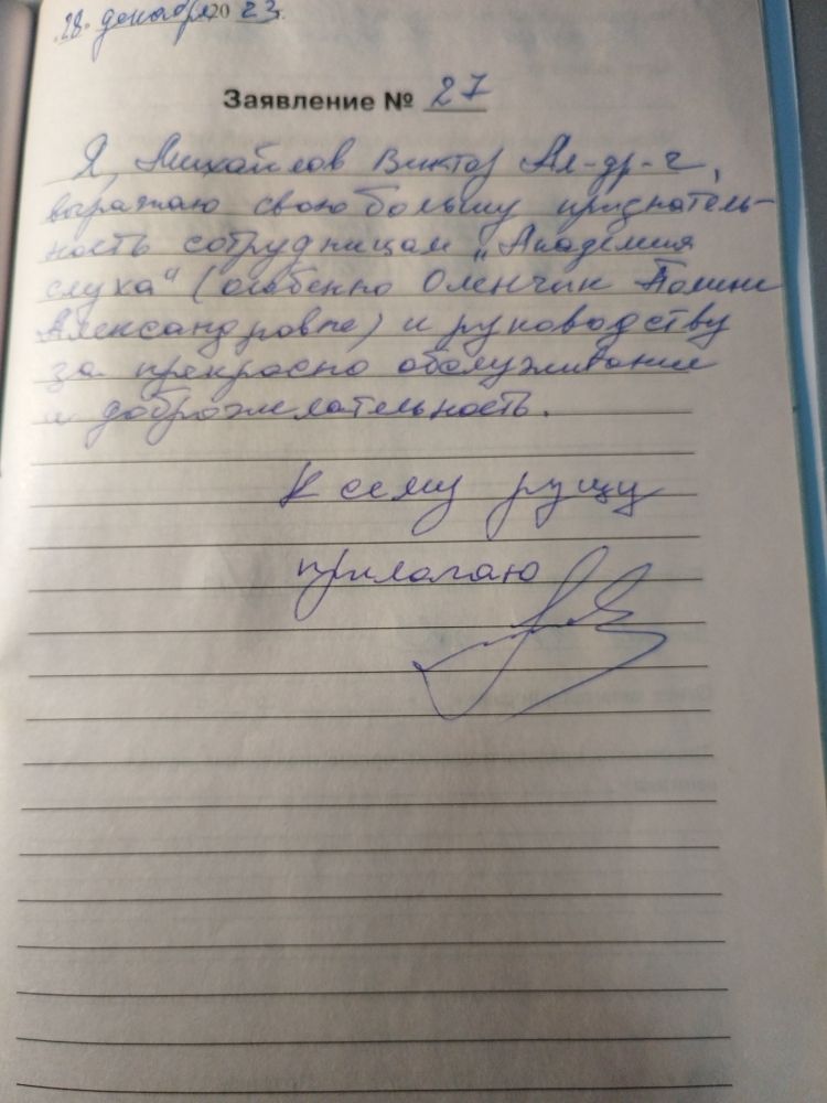 Я, Михайлов Виктор Александрович, выражаю свою большую признательность сотрудникам "Академии слуха" особенно Оленчик Полине Александровне и руководству за прекрасное обслуживание и доброжелательность.