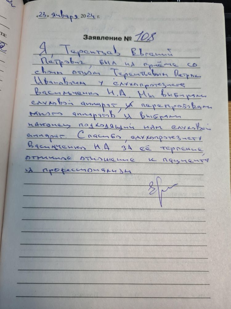 23.01.2024 Я, Терентьев Евгений Петрович, был на приёме со своим отцом Терентьевым Петром Ивановичем у слухопротезиста Васильченко НА. Мы выбирали слуховой аппарат, перепробовали много аппаратов и выбрали наконец подходящий нам слуховой аппарат. Спасибо, слухопротезисту Васильченко НА за её терпение отличное отношекние к пациенту и профессионализм.