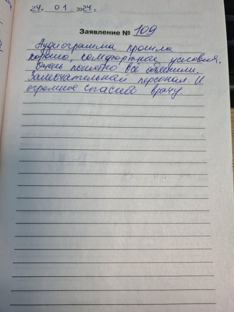 24.01.2024 Аудиограмма прошла хорошо, комфортные условия. Очень понятно всё объяснили. Замечательный персонал и огромное спасибо врачу