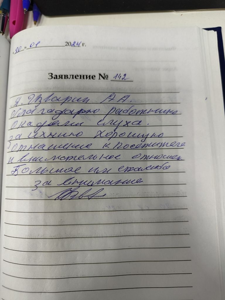 Я Изварин А.А. благодарю работников академии слуха за ихние хорошее отношения к посетителям и внимательное отношение. Большое им спасибо за внимание.
