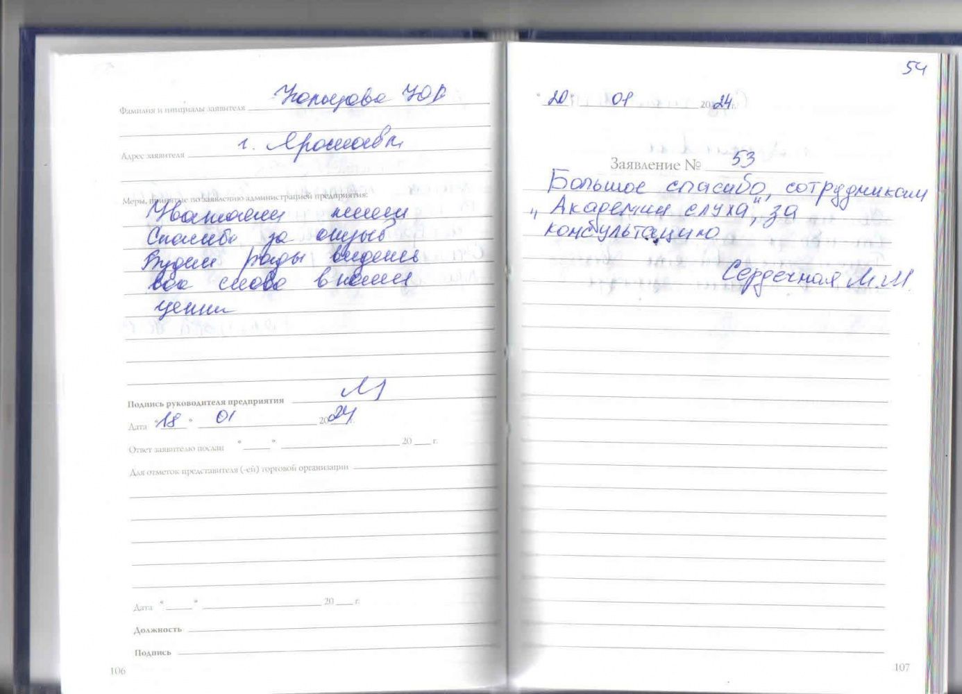 Я, Говорунов Николай Никифорович выражаю благодарность работникам "Академии слуха" за чуткое и внимательное отношение при подборе аппарата Microtech. Большое спасибо!!!