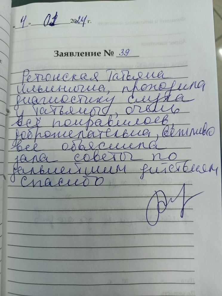 Ретюнская Татьяна Ильинична, проходила диагностику слуха у Татьяны, очень все понравилось, доброжелательна, вежливо все объяснила, дала советы по дальнейшим действиям. Спасибо.