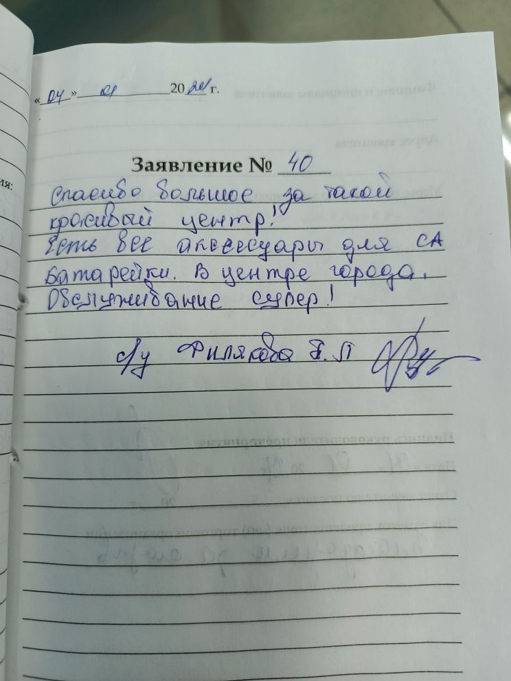 Спасибо большое за такой красивый центр! Есть все аксессуары для СА, батарейки. В центре города. Обслуживание супер!