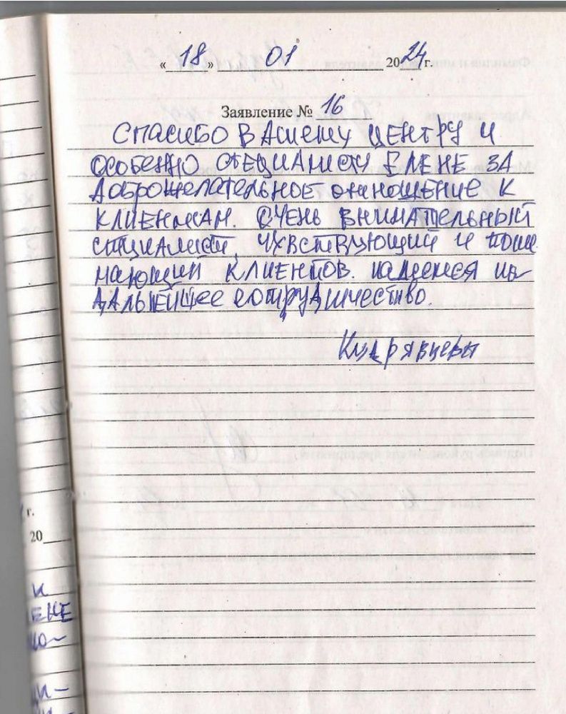 Спасибо Вашему Центру и особенно специалисту Елене за доброжелательное отношение к клиентам . Очень внимательный специалист, чувствующий и понимающий клиентов. Надеемся на дальнейшее сотрудничество.