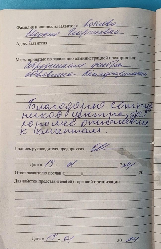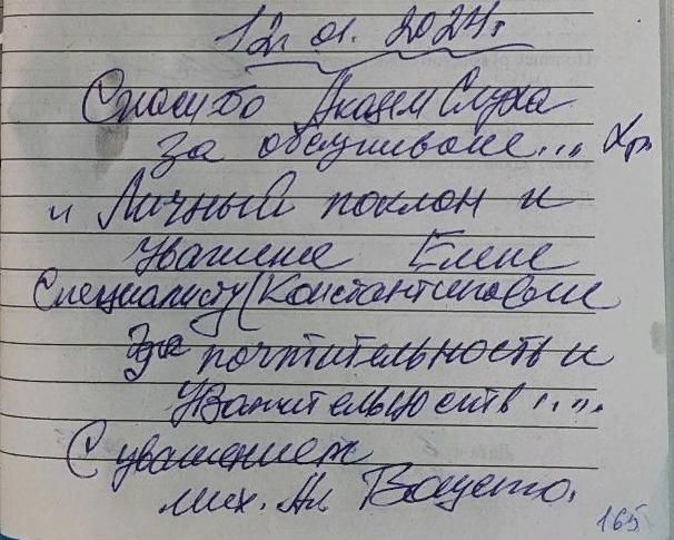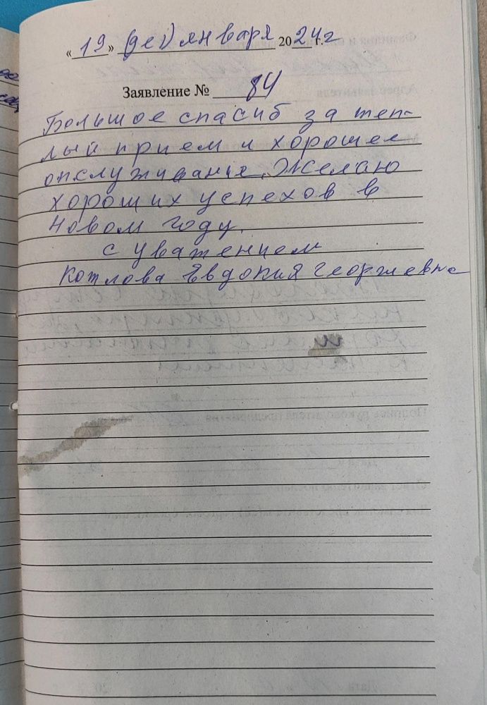 Большое спасибо за теплый прием и хорошее обслуживание . Желаю хороших успехов в новом году .