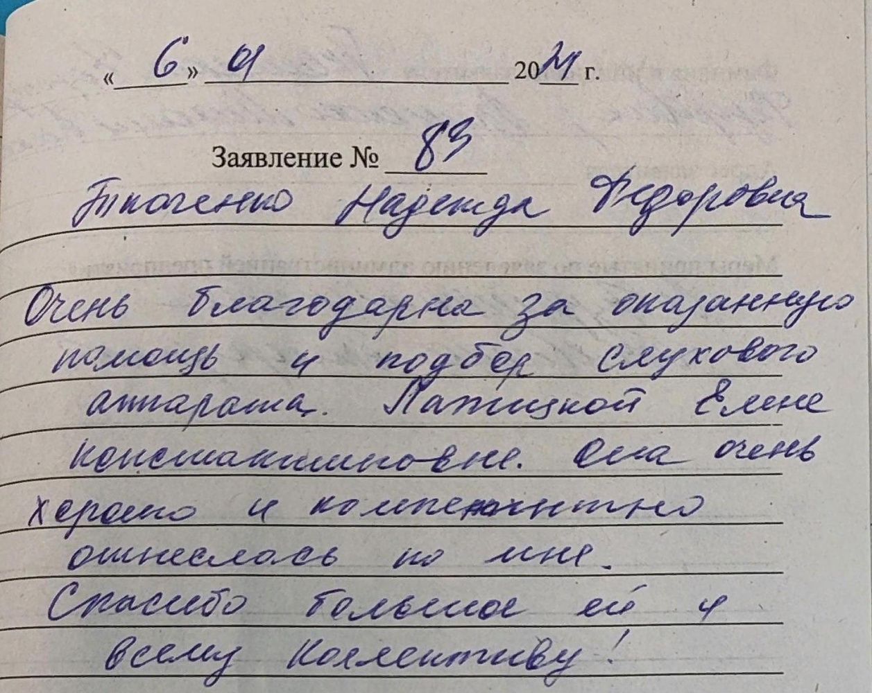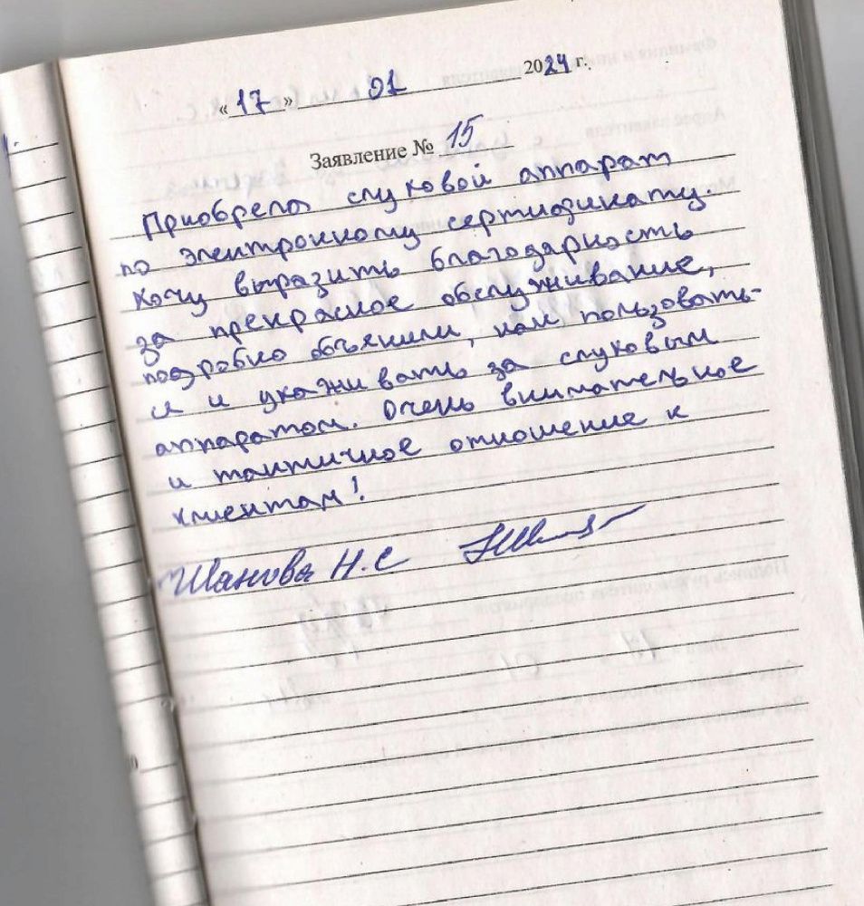 Приобрела слуховой аппарат по электронному сертификату .Хочу выразить благодарность за прекрасное обслуживание, подробно объяснили, как пользоваться и ухаживать за слуховым аппаратом. Очень внимательное и тактичное отношение к клиентам!