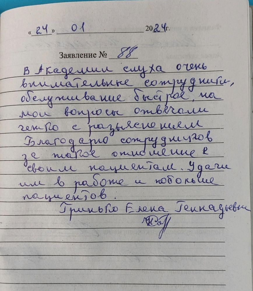 Я Рожнова Тамара Александровна 23.09.1944 г.р. Являюсь клиентом "Академии Слуха" , обращаясь за помощью, и консультацией получаю её всегда. Сотрудники очень вежливые, добросовестные, понимающие, высококвалифицированные специалисты , все услуги оказывают вовремя и очень качественно , за все благодарна.
