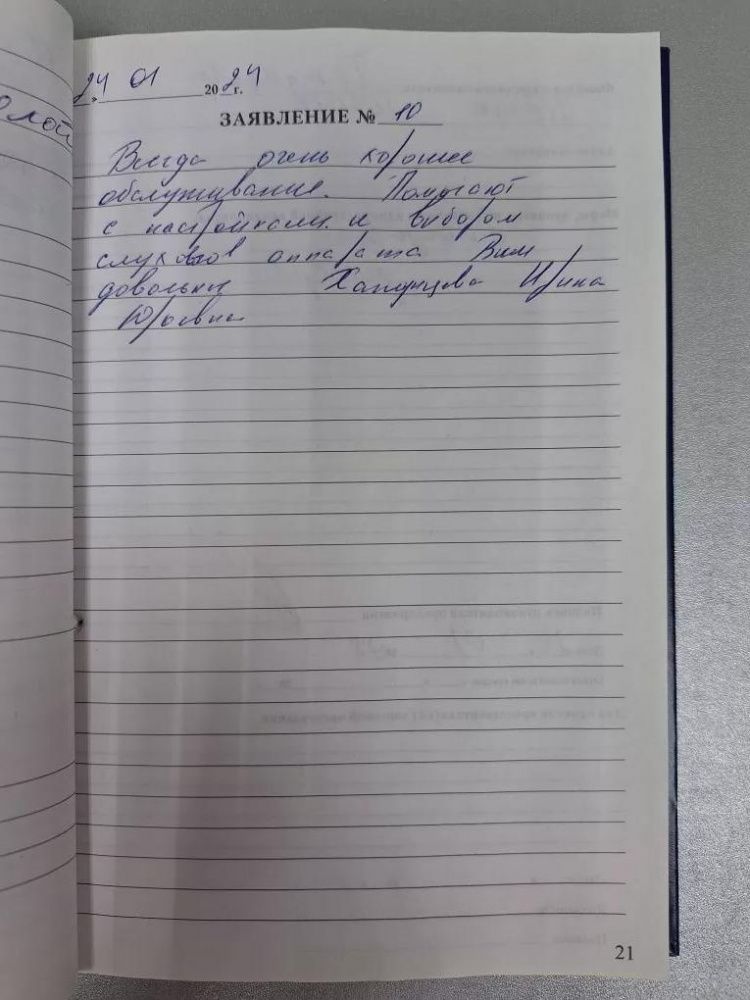 Меня зовут Наталья, приехали во второй раз в этот центр 13 декабря, экстренно так как сказать с бабушкой для замены аппарата. Сотрудники оказались очень конпитентны и вежливы!!! Спасибо огромное вам за вашу работу и профессионализм. Аппарат оказался лучше чем был, продали все комплектующие для чистки и ухода за аппаратом + гарантия на уход. Спасибо огромное, бабушка слышит!!!