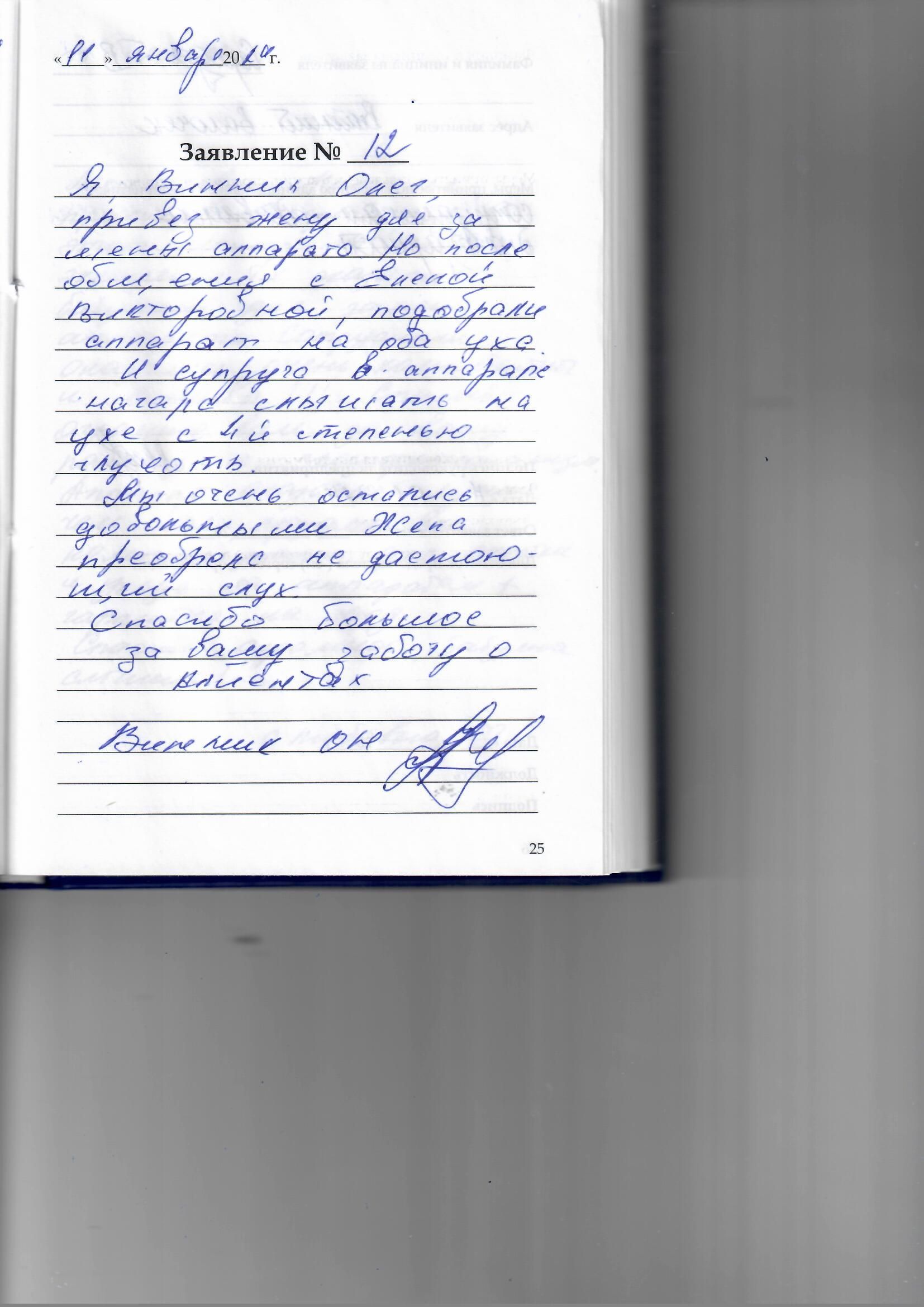 Я, Винник Олег, привез жену для замены аппарата. Но после общения с Еленой Викторовной, подобрали аппарат на оба уха. И супруга в аппарате начала слышать на ухе с 4-й степенью глухоты. Мы очень остались довольны. Жена приобрела недостающий слух. Спасибо большое за вашу заботу о клиентах.
