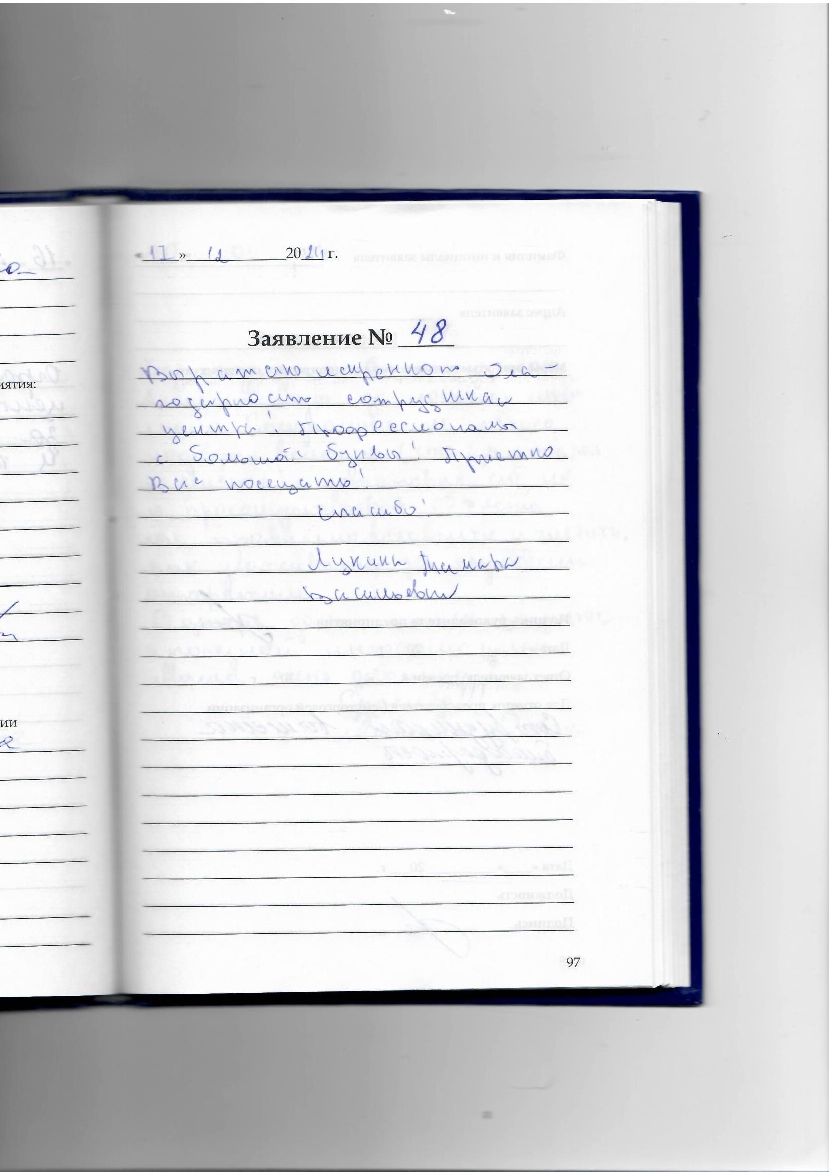 Я уже несколько раз посещаю ваш центр и искренне хочу выразить слова благодарности сотрудникам коллектива, очень внимательные, доброжелательные, отзывчивые, добрые и хорошие! От всей души поздравляю их с наступающим новым годом!!!Желаю им здоровья, счастья, семейного благополучия и конечно творческих успехов.