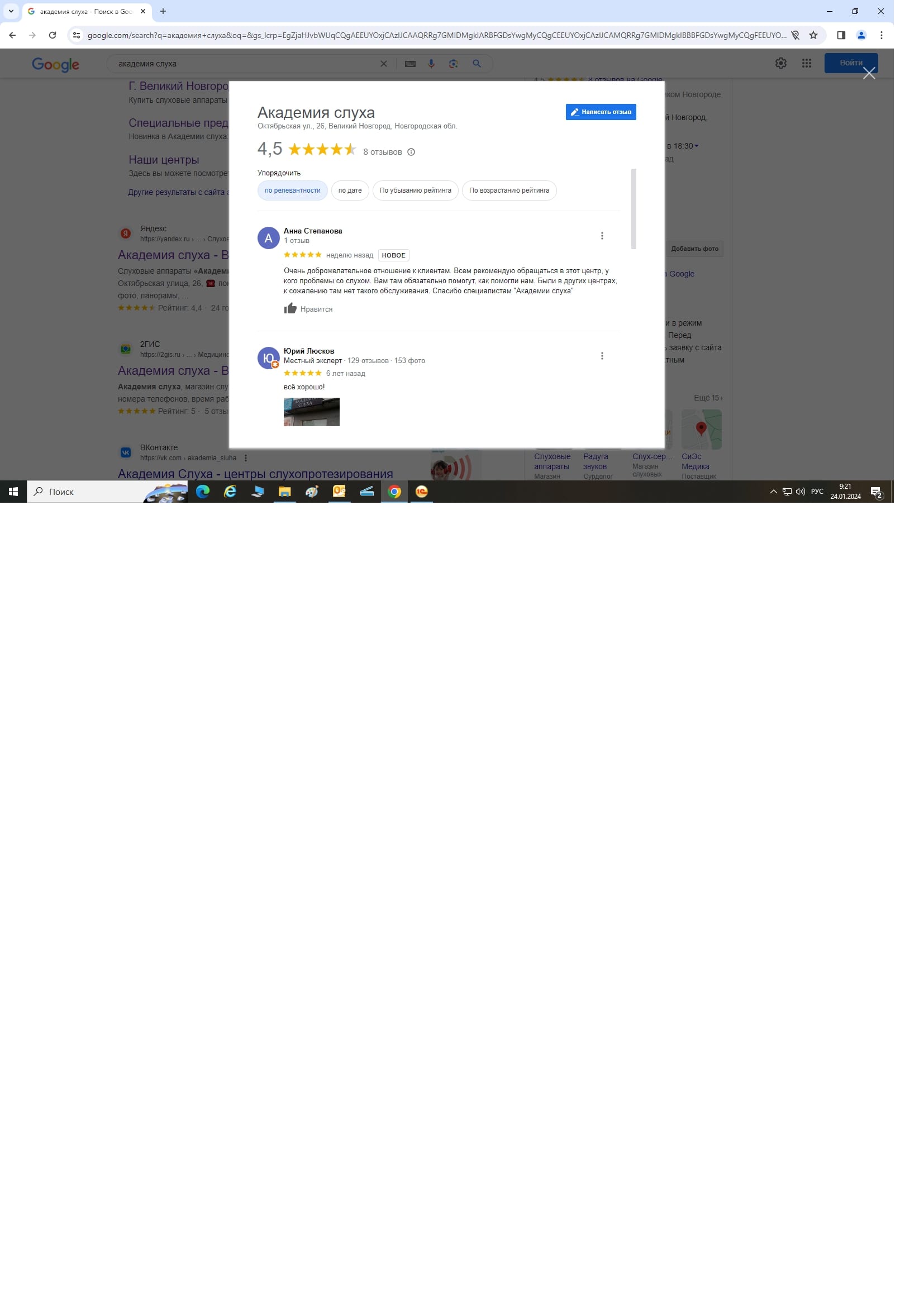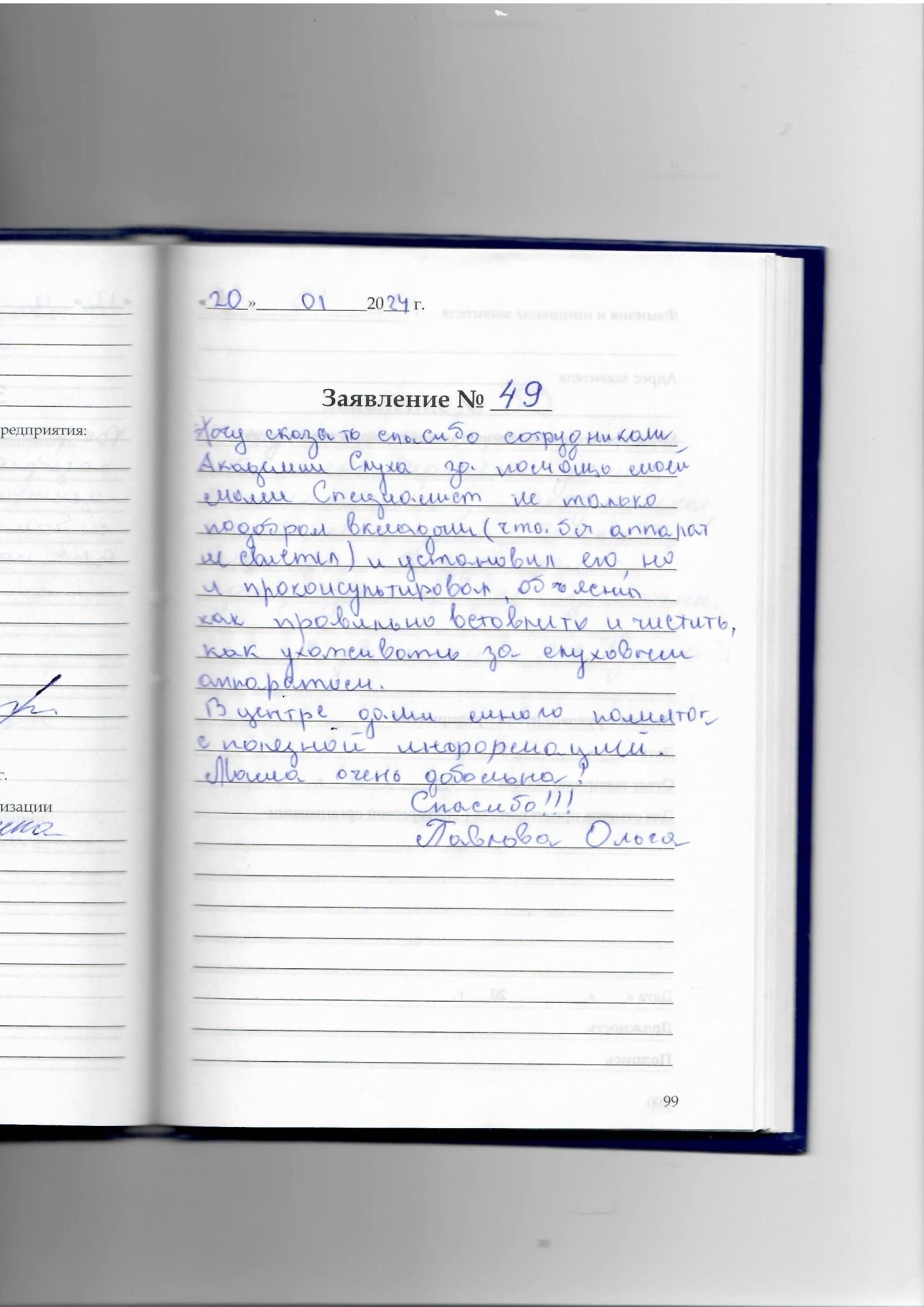 Хочу сказать спасибо сотрудникам Академии слуха за помощь моей мамы Специалист не только подобрал вкладыш (чтобы аппарат не свистел) и установил его, но и проконсультировал, объяснил как правильно вставлять и чистить, как ухаживать за слуховым аппаратом.