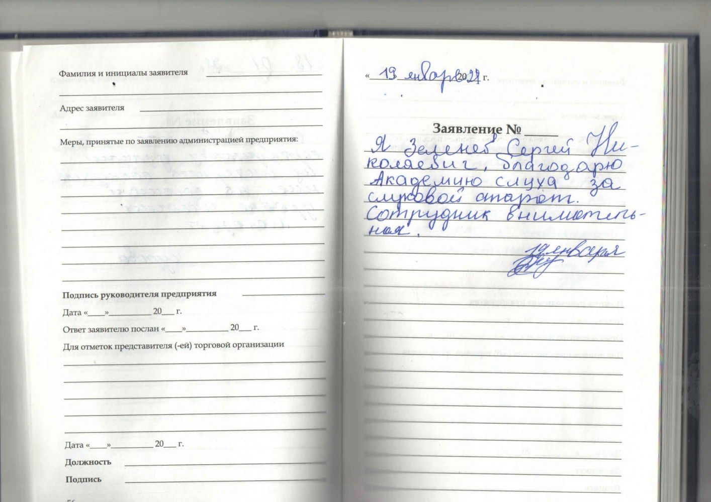 Я, Зеленев Сергей Николаевич, благодарю Академию слуха за слуховой аппарат. Сотрудник внимательная.