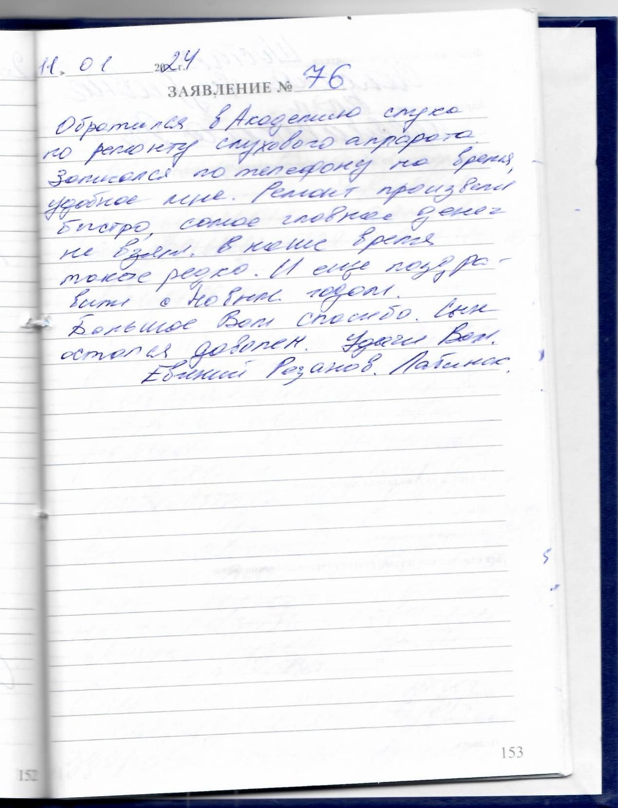 Обратился в Академию слуха по ремонту слухового аппарата. Записался по телефону на время удобное мне. Ремонт произвели быстро, самое главное денег не взяли. В наше время такое редко. И еще поздравили с Новым годом. И еще поздравили с Новым годом! Большое Вам спасибо. Сын остался доволен. Удачи Вам. Евгений Рязанов