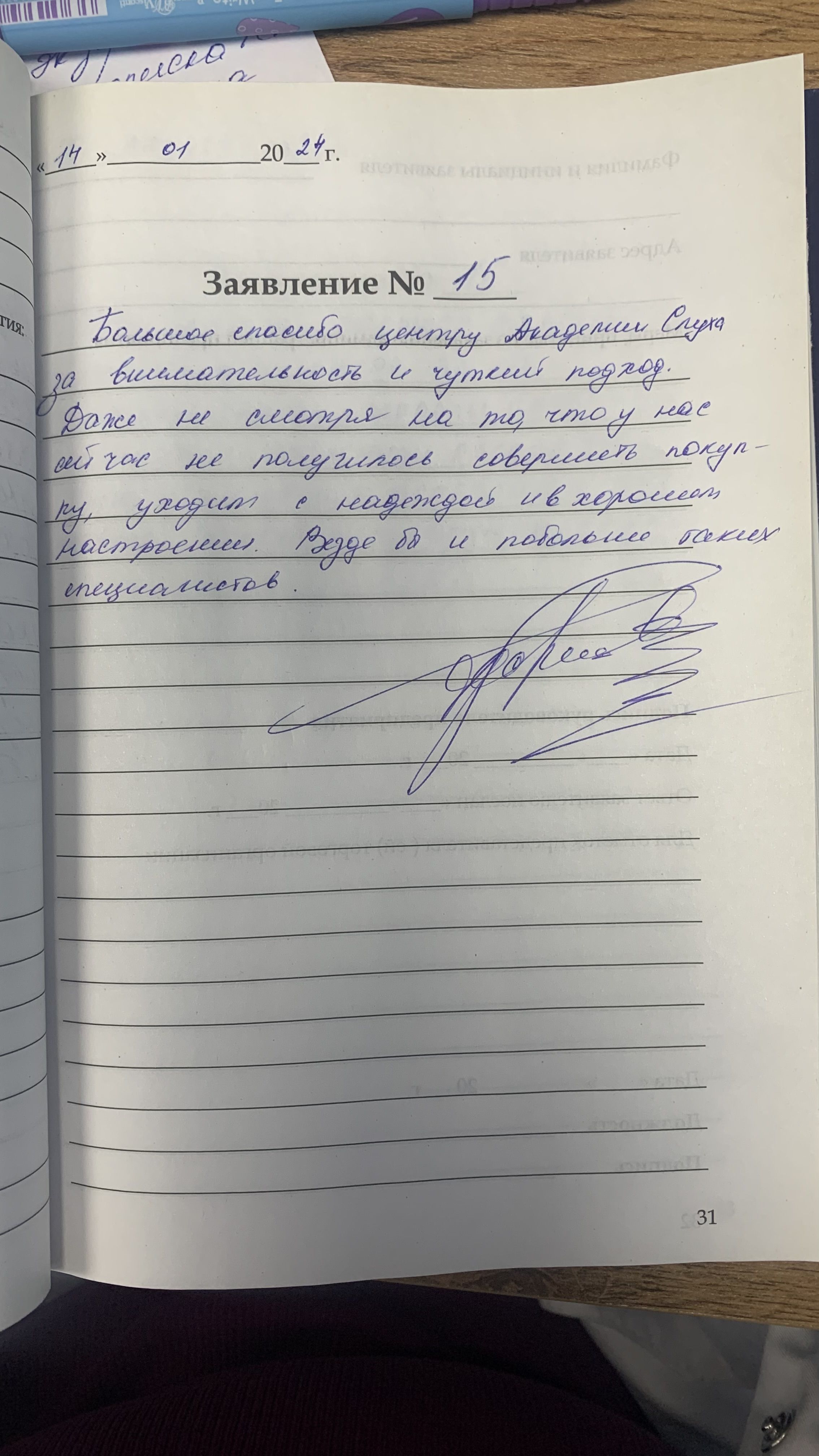 Большое спасибо центру Академия Слуха за внимательность и чуткий подход. Даже не смотря на то, что у нас сейчас не получилось совершить покупку, уходим с надеждой и в хорошем настроении. Везде бы и побольше таких специалистов.