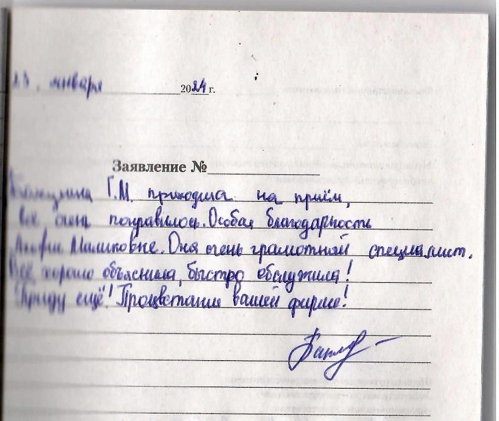 Я, Бакунина Г.М. приходила на приём, всё очень понравилось. Особая благодарность Альфие Маликовне. Она очень грамотный специалист. Всё хорошо объяснила, быстро обслужила! Приду ещё! Процветания вашей фирме!