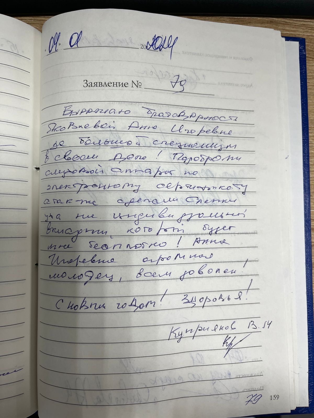Выражаю благодарность Яковлевой Анне Игоревне за большой специализм в своем деле! Подобрали слуховой аппарат по электронному сертификату а так-же сделали слепки уха на индивидуальный вкладыш, который будет мне бесплатно! анна Игоревна огромная молодец, всем доволен! С новым годом! Здоровья! Куприянов В М