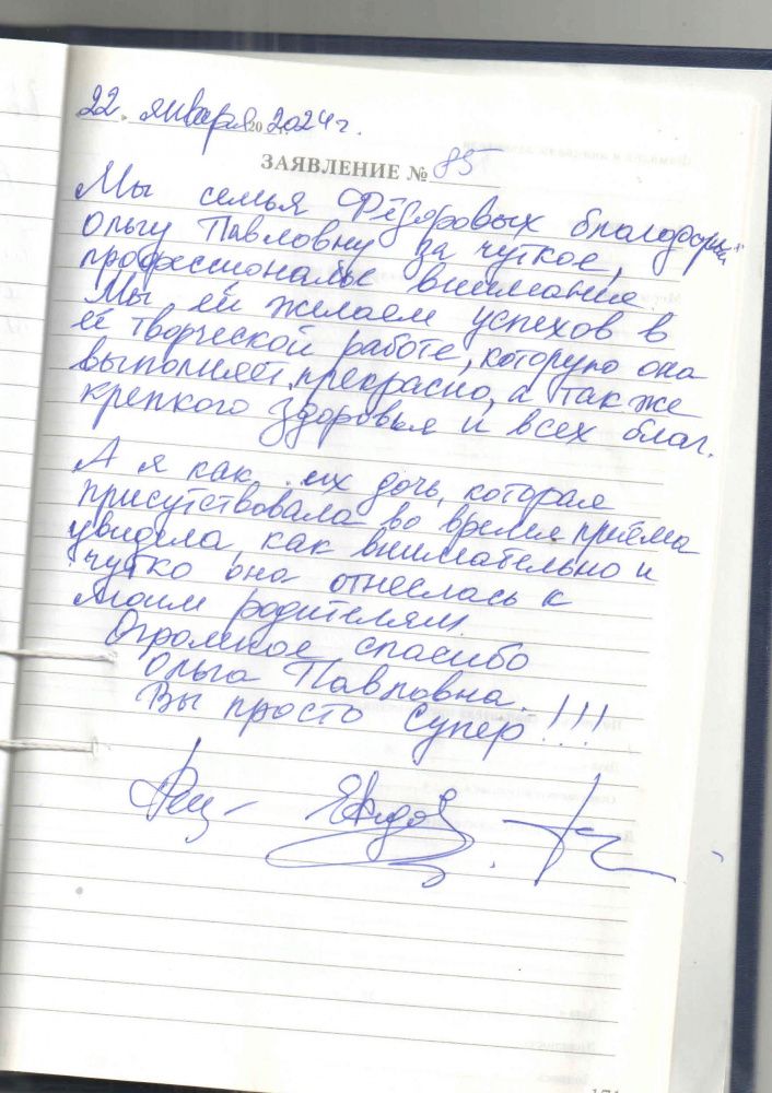Мы семья Фёдоровых благодарим Ольгу Павловну за чуткое, профессиональное внимание. Мы ей желаем успехов в её творческой работе, которую она выполняет прекрасно, а также крепкого здоровья и всех благ. А я как их дочь которая присутствовала во время приёма увидела как внимательно чутко она отнеслась к моим родителям. Огромное спасибо Ольга Павловна Вы просто супер!!!