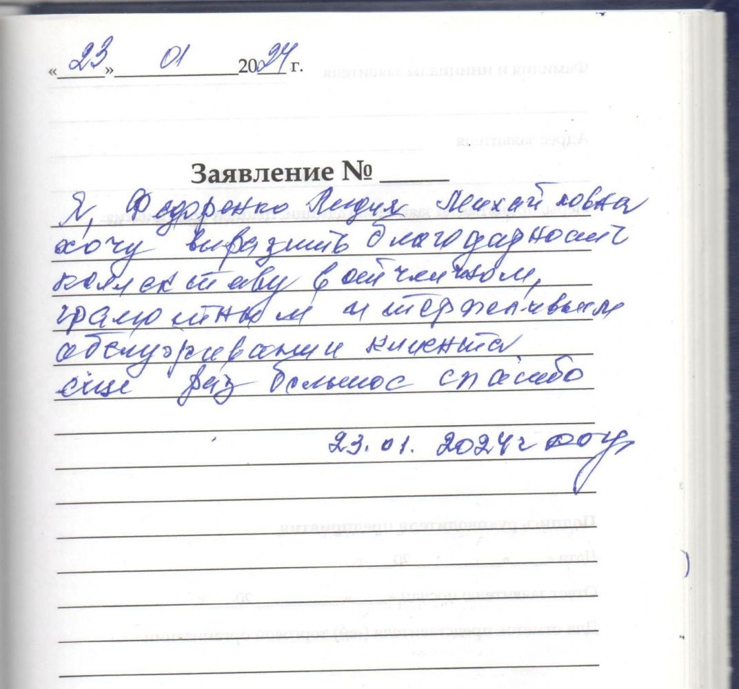 Я, Федоренко Лидия Михайловна хочу выразить благодарность коллективу в отличном грамотном и терпеливом обслуживании клиента. Еще раз большое спасибо.