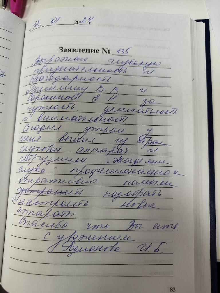 Выражаю глубокую признательность, и благодарность Томилину В.В. и Сорокиной Е.Н. за чуткость, деликатность и внимательность. Сегодня утром у меня вышел из строя слуховой аппарат, и сотрудники академии слуха профессионально и оперативно помогли подобрать и настроить новые аппараты. Спасибо что вы есть, с уважением Родионова И.Б.