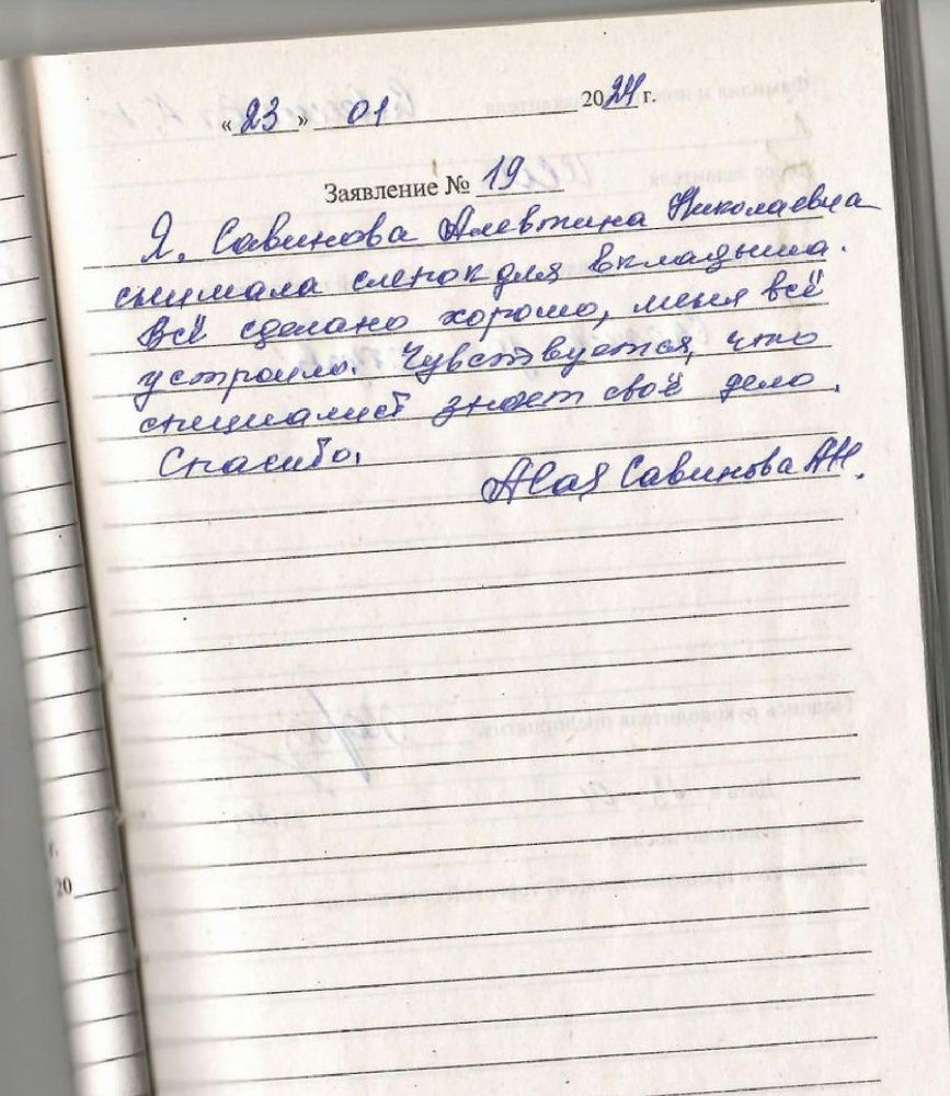 Я, Савинова Алевтина Николаевна, снимала слепок для вкладыша. Все сделано хорошо, меня все устроило. Чувствуется, что специалист знает свое дело. Спасибо.