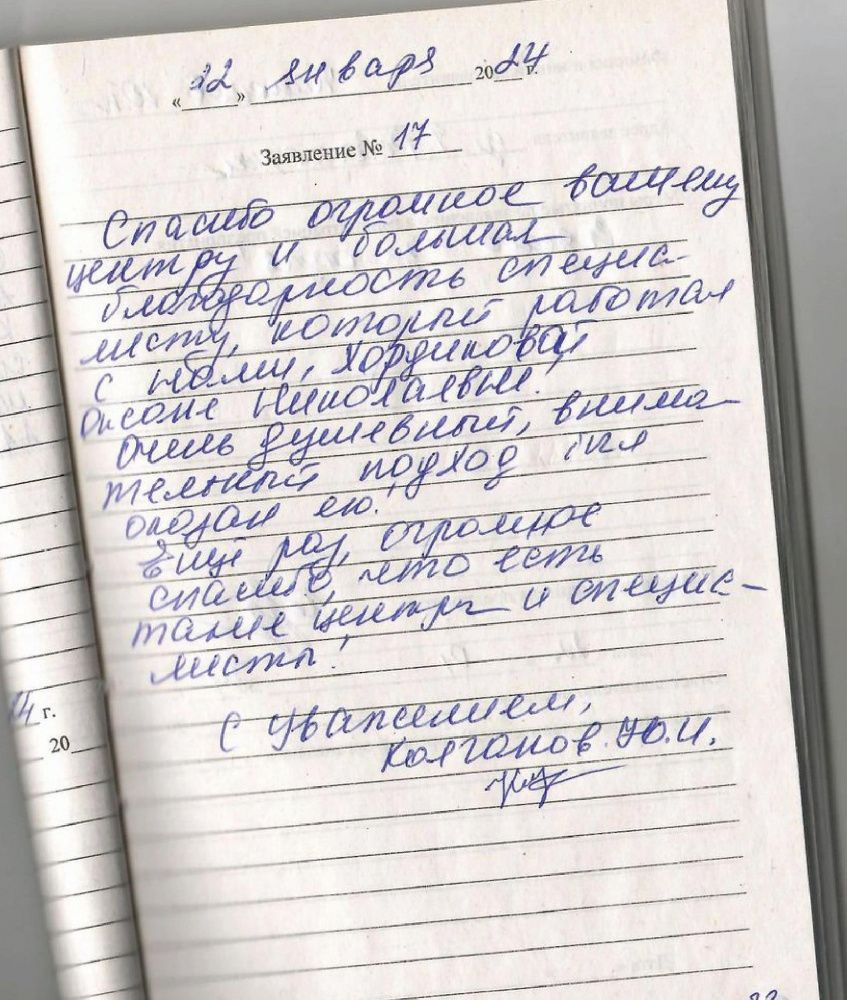 Спасибо огромное Вашему Центру и большая благодарность специалисту, который работал с нами Хордиковой Оксане Николаевне. Очень душевный, внимательный подход был оказан ею! Еще раз огромное спасибо, что есть такие центры и специалисты!