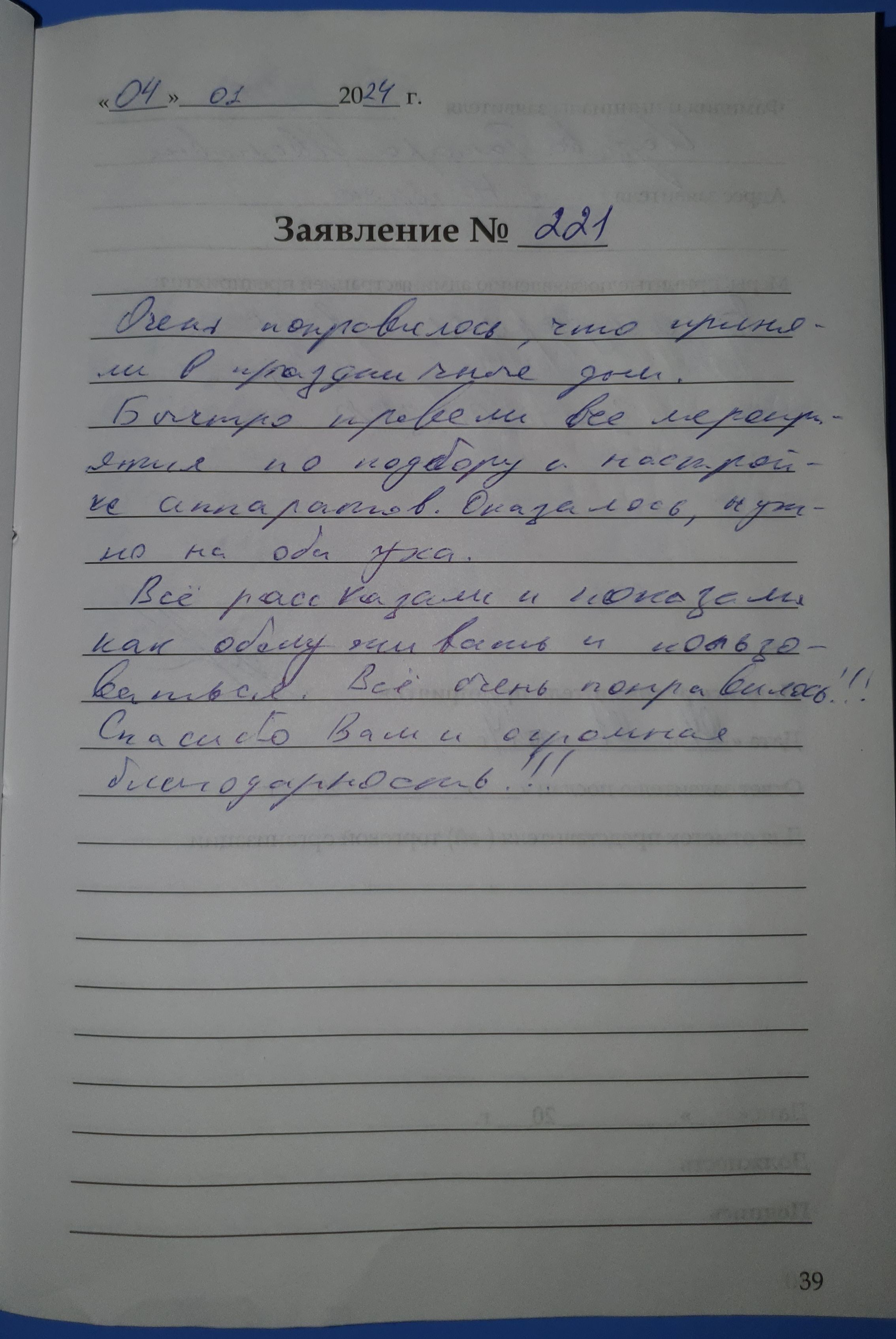Очень понравилось, что приняли в праздничные дни. Быстро провели все мероприятия по подбору и настройке аппаратов. Оказалось, что нужно на оба уха. Всё рассказали и показали как обслуживать и пользоваться. Всё очень понравилось!!! Спасибо Вам и огромная благодарность!!! Исупова Тамара Ивановна, п. Нагорск