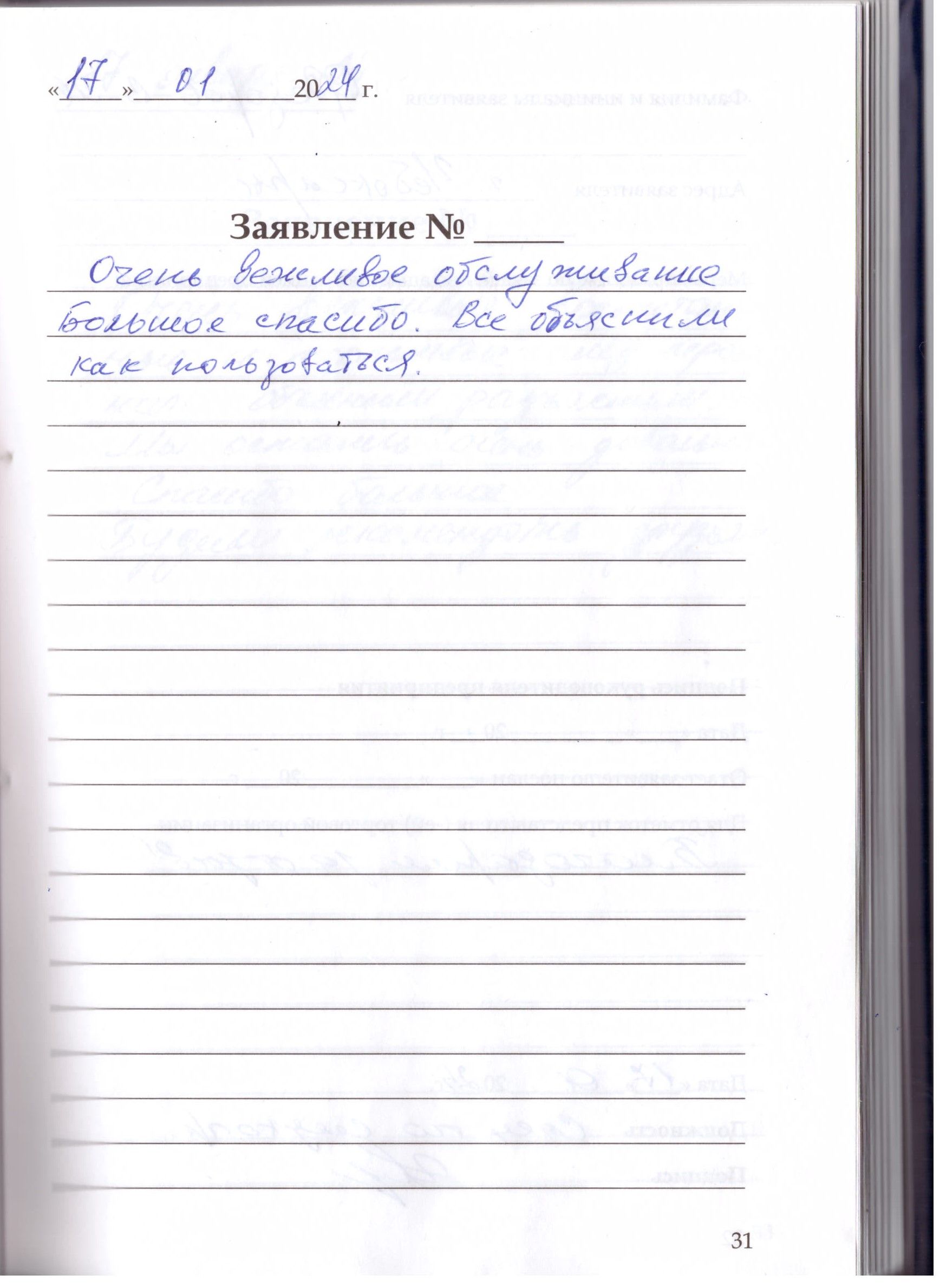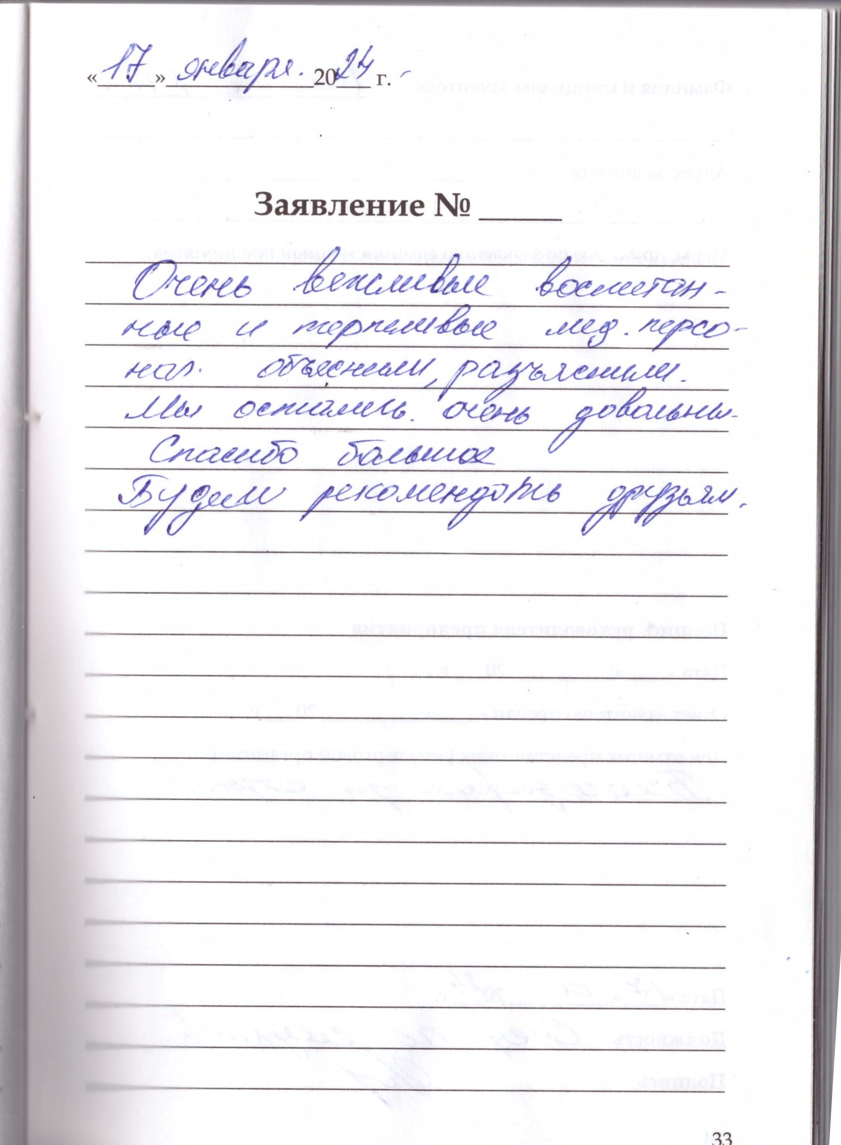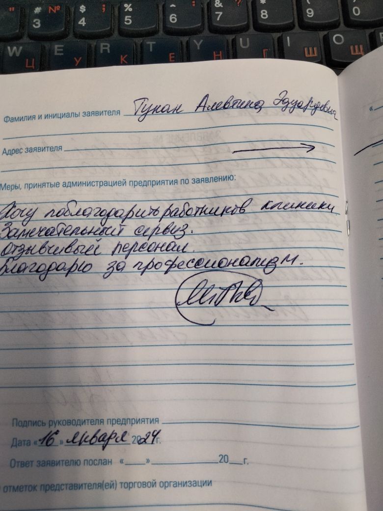 16.01.2024 Хочу поблагодарить работников клиники. Замечательный сервис. Отзывчивый персонал. Благодарю за профессионализм.