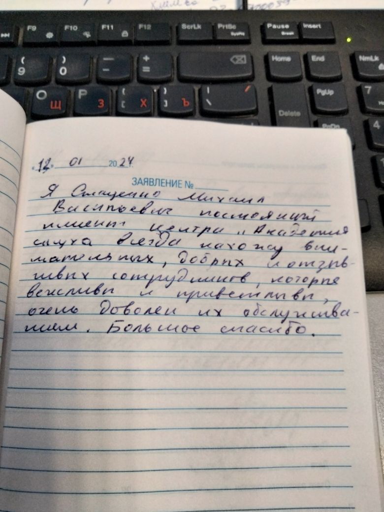 Я, Стаценко Михаил Васильевич, постоянный клиент центра "Академия Слуха", всегда нахожу внимательных, добрых и отзывчивых сотрудников, которые вежливы, очень доволен их обслуживанием. Большое спасибо.