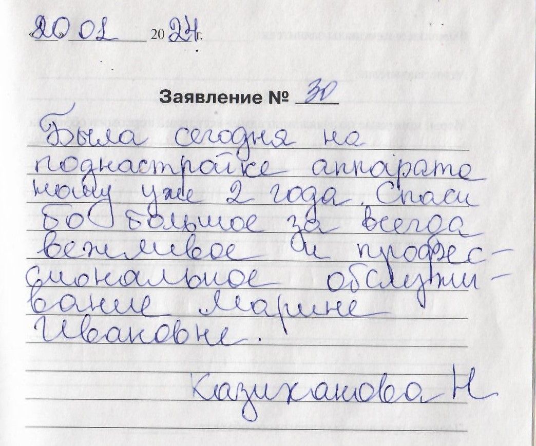Была сегодня на поднастройке аппарата, ношу уже 2 года. Спасибо большое за всегда вежливое и профессиональное обслуживание Марине Ивановне.