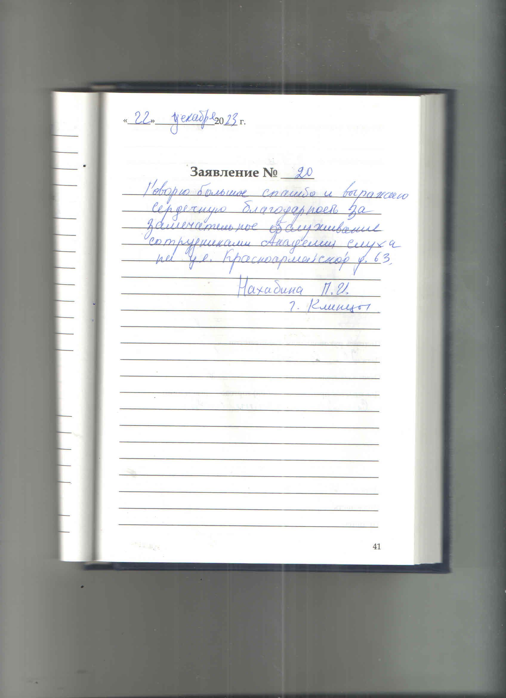 Говорю большое спасибо и выражаю сердечную благодарность за замечательное обслуживание сотрудниками Академии слуха на ул.Красноармейской д.63.Нахабина П.И. г.Клинцы