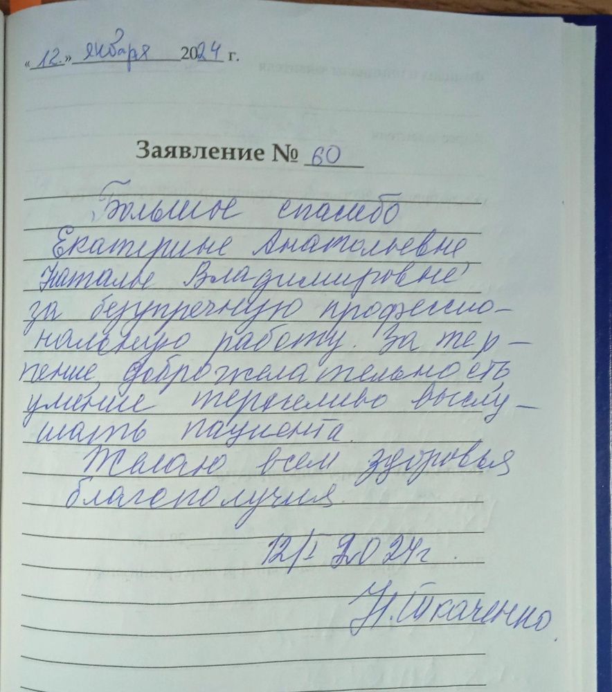 Большое спасибо ,Екатерине Анатольевной, Наталье Владимировне за безупречную профессиональную работу. За терпение, доброжелательность, умение терпиливо услышать пациента.