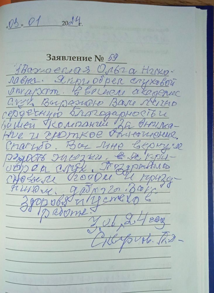 Уважаемая Ольга Николаевна, я приобрел слуховой аппарат в вашем центре "Академия слуха". выражаю Вам лично сердечную благодарность и вашей компании за внимание и чуткое отношение. Спасибо. Вы мне вернули радость жизни,я приобрел слух. Поздравляю с новым годом , доброго вам здоровья и успехов в работе