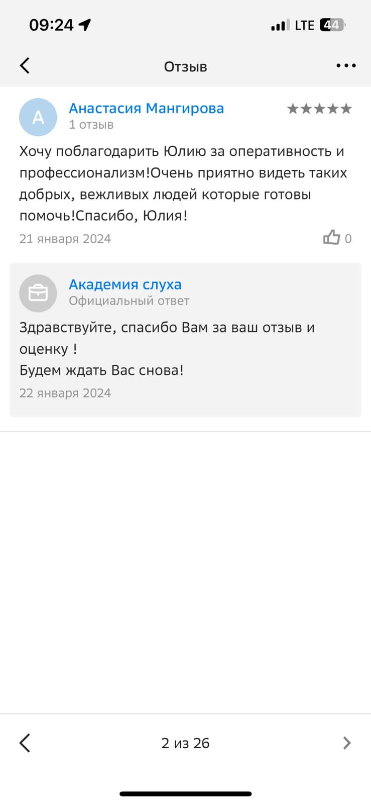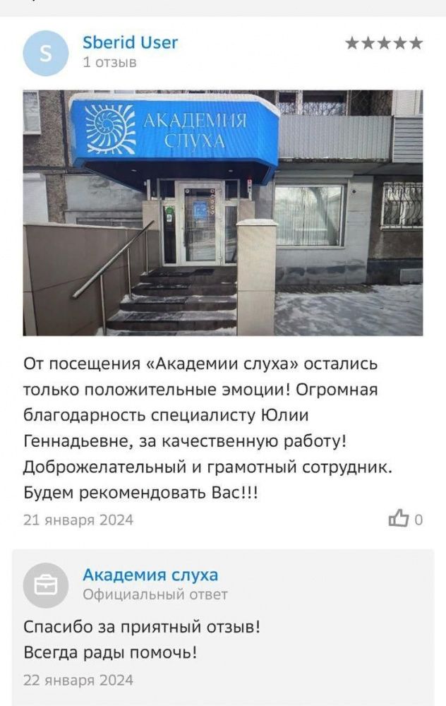 От посещения "Академии слуха" остались только положительные эмоции! Огромная благодарность специалисту Юлии Геннадьевне, за качественную работу! Доброжелательный и грамотный сотрудник. Будем рекомендовать вас!!!