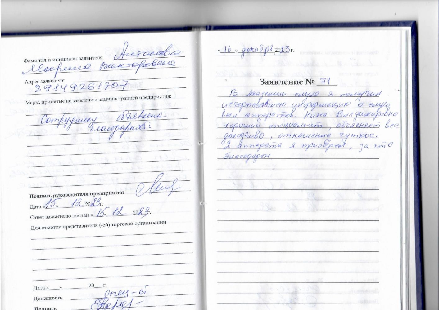 Выражаю благодарность сотрудникам. Получила бесплатный аппарат.