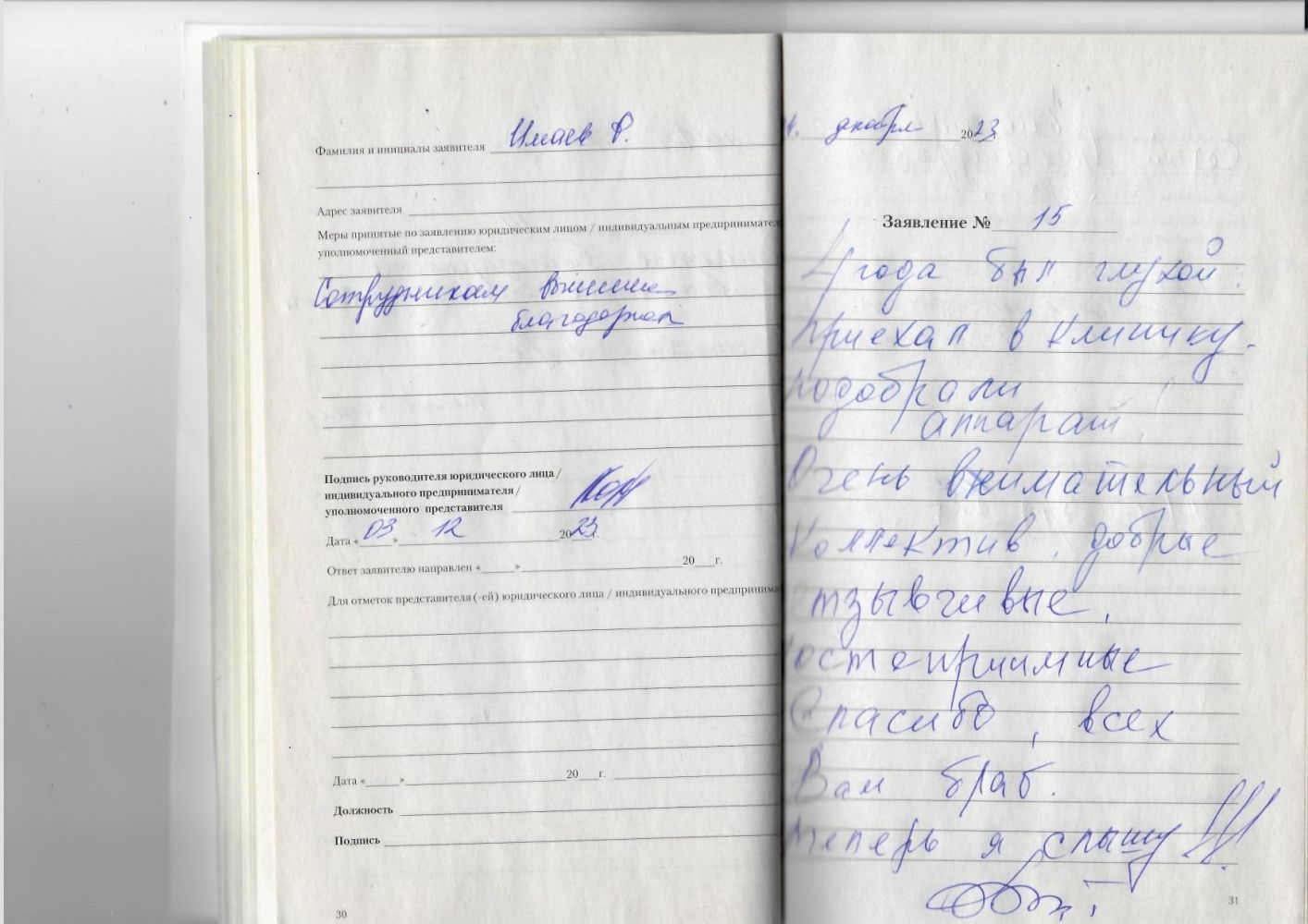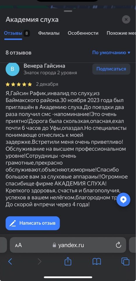 Я, Гайсин Рафик, инвалид по слуху из Баймакского района. 30 ноября 2023 года был приглашен в Академию слуха. До поездки два раза получил смс - напоминание! Это очень приятно! Дорога была скользкая, опасная, ехал почти 6 часов до Уфы, опоздал. Но специалисты понимающе отнеслись к моей задержке. Встретили меня очень приветливо! Обслуживание на высшем  профессиональном уровне! Сотрудницы- очень грамотные, прекрасно обслуживают, объясняют, юморные. Спасибо большое вам за слуховые аппараты. Огромное спасибище фирме АКАДЕМИЯ СЛУХА! Крепкого здоровья, счастья и благополучия, успехов в вашем нелегком, благородном труде. До скорой встречи через 4 года.